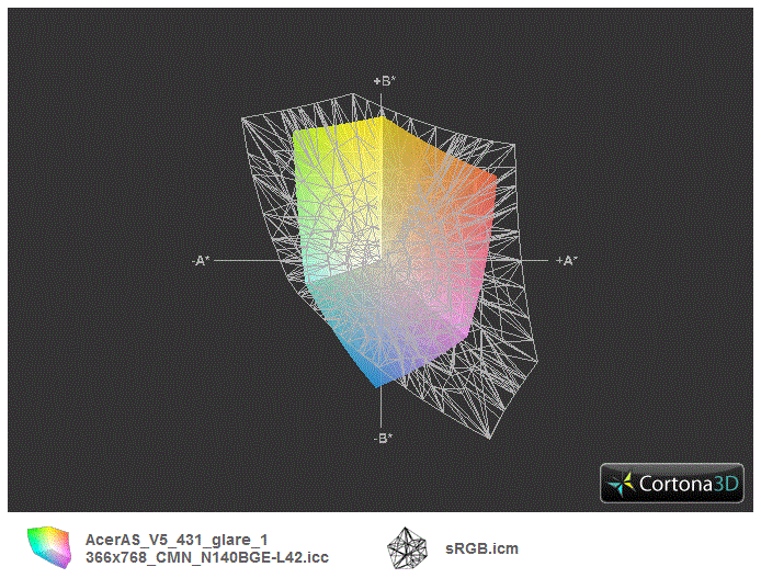 Der niedrige Kontrast von 147:1 überrascht nicht. Der Glare-Type-Panel bessert die optische Farbwirkung wieder etwas auf, was aber die Messung unbeeindruckt lässt. Auch wenn das V5-431 keine Profis ansprechen wird, schauen wir der Vollständigkeit wegen auf den Farbraum. Dieser ist sehr klein, sRGB wird zu zirka 60 % abgedeckt. Dass es noch schlechter geht, zeigt Lenovos IdeaPad S300 im Vergleich.