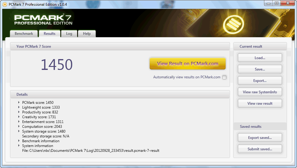 | PCMark 7 Score | 1450 Punkte | |