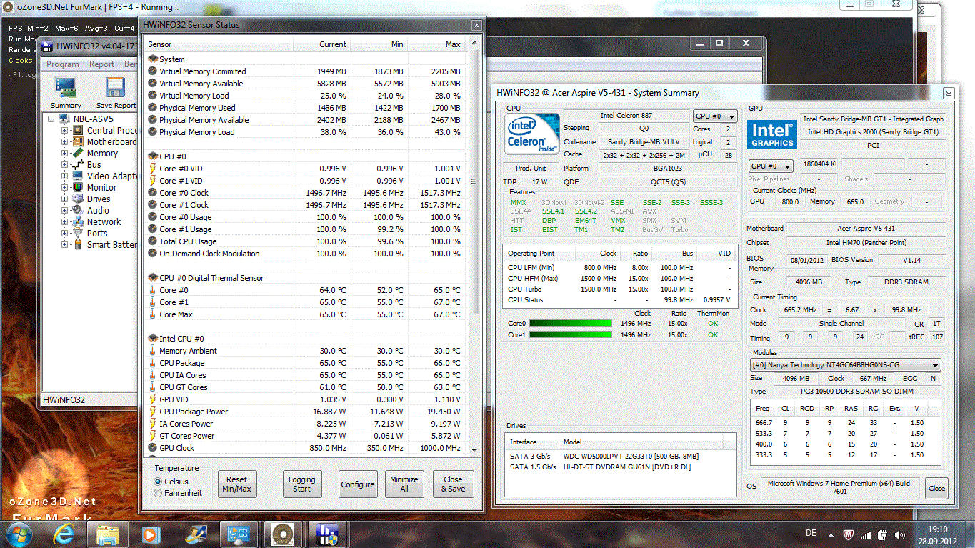 Thermisches Throttling ist bei Non-Turbo-Boost-Systemen selten ein Thema. Unser V5-431 hält seine 1,5 GHz auch Stresstest konstant. Der Sensor am Celeron meldet unterdessen ungefährliche 67 Grad Celsius.