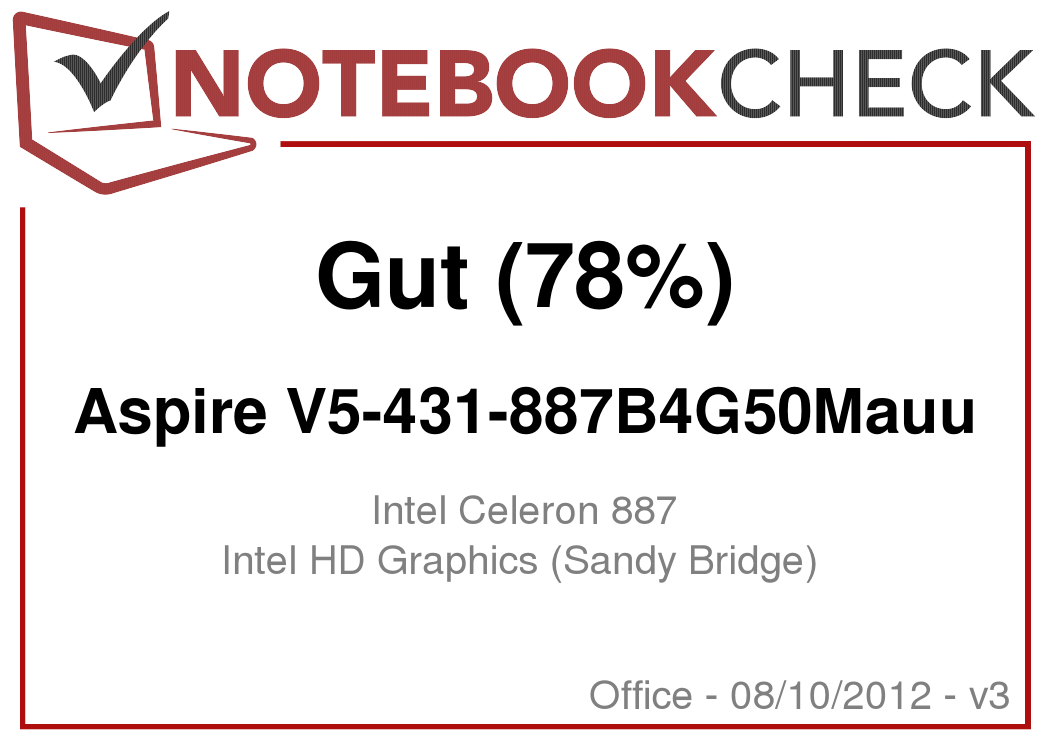 Die Acer Website listet den Aspire V5-431 nur als Pentium-967-Variante. Aktuelle Shop-Angebote liefern derzeit aber lediglich den Intel Celeron 887 (2x 1,5 GHz), wie er in unserem Testgerät steckt. Der 17-Watt-Low-Voltage-Kern der Sandy-Bridge-Architektur (2010-2011) ist ein vornehmlich in 11,6-Zollern eingesetzter Einstiegs-Prozessor, der um Features wie Turbo Boost und Hyper Threading kastriert wurde. Ob es sich lohnt, auf die Pentium-Version zu warten, das klären wir im Folgenden.