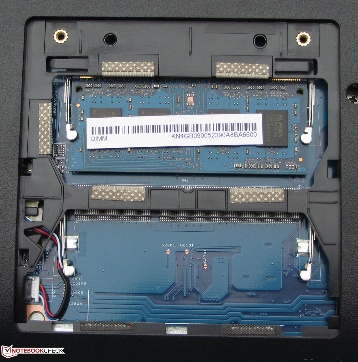 Auf der Unterseite des Notebooks findet sich eine kleine Wartungsklappe, hinter der die zwei Arbeitsspeicherbänke des Aspires sitzen. Nur eine Bank ist mit einem 4-GB-Modul belegt. Das Notebook unterstützt bis zu 8 Gigabyte Arbeitsspeicher. Ein zusätzliches 4-GB-Modul kostet aktuell etwa 15 bis 20 Euro. Wer die Festplatte austauschen möchte oder den Lüfter reinigen will, muss die Unterseite des Gehäuses demontieren. Wir haben bei unserem Testgerät darauf verzichtet.