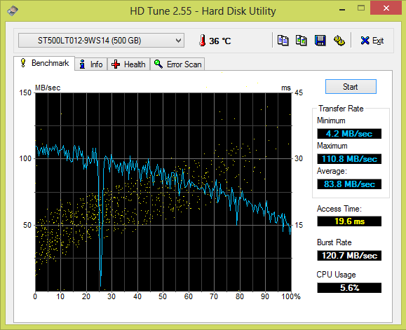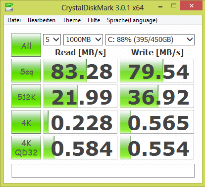 Acer bestückt das Aspire mit einer Festplatte aus der Momentus Thin Serie von Seagate. Sie besitzt eine Kapazität von 500 GB und arbeitet mit 5.400 Umdrehungen pro Minute. CrystalDiskMark meldet eine Lesegeschwindigkeit von 83,28 MB/s. HD Tune liefert eine durchschnittliche Transferrate von 83,8 MB/s. Diese Werte gehen für eine 5.400er-Festplatte in Ordnung.