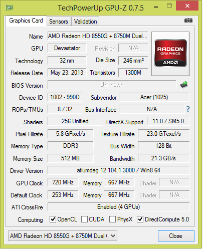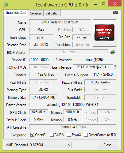 Acer hat das Aspire mit einer Dualgrafiklösung ausgestattet. Neben der integrierten Radeon HD 8550G GPU steckt auch ein dedizierter Radeon HD 8750M Grafikkern in dem Rechner. Beide GPUs unterstützen DirectX 11. Die zwei Chips bilden einen sogenannten Crossfire-Verbund, d. h. beide Kerne können an der Berechnung der dargestellten Bilder arbeiten. Das ist beispielsweise bei Computerspielen der Fall. Bei wenig leistungsfordernden Aufgaben wie der DVD-Wiedergabe oder auch im Akkubetrieb wird nur die integrierte GPU benutzt. Nichtsdestotrotz kann im Treibermenü für jede Anwendung festgelegt werden, ob diese mit der Dualgrafiklösung ausgeführt werden soll. Auch kann die Dualgrafik komplett deaktiviert werden. Es arbeitet dann nur die integrierte GPU.