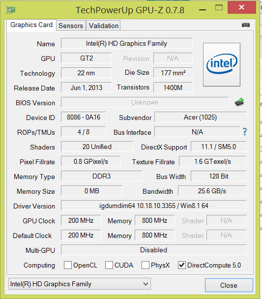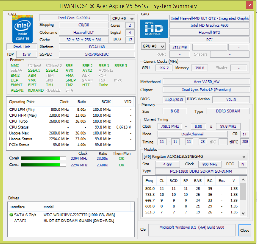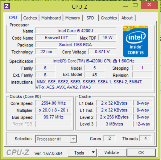 Das Aspire wird von einem Core i5-4200U Zweikernprozessor angetrieben. Hierbei handelt es sich um ein Modell der Haswell Prozessorgeneration, das mit einer Basisgeschwindigkeit von 1,6 GHz arbeitet. Per Turbo kann die Geschwindigkeit auf 2,3 GHz (beide Kerne) bzw. 2,6 GHz (nur ein Kern) erhöht werden. Mit einer TDP von 15 Watt gehört er zu den sparsamen Vertretern seiner Art.