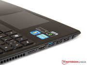 Abgesehen von dem 2-in-1-Kartenleser an der Vorderseite wurden alle Schnittstellen links am Gehäuse platziert, wodurch sich zwei mögliche Einschränkungen ergeben: Zum einen ist es für Linkshänder kaum möglich, Kabel und angeschlossene Geräte außerhalb des eigenen Arbeitsbereiches zu halten. Zum anderen fallen die Abstände zwischen den einzelnen Anschlüssen sehr gering aus, was insbesondere bei breiten USB-Sticks zu Platzproblemen führen kann. Besser wäre es, wenn Acer auch die Rückseite des Notebooks mit Schnittstellen bestückt hätte.