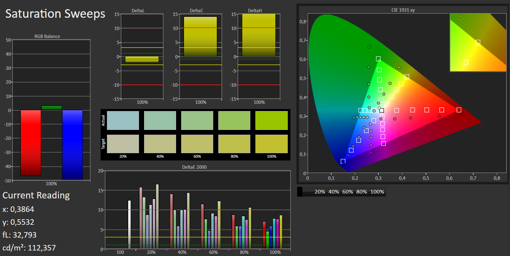 | AdobeRGB 1998 Coverage (%) | 83.3 | 44.47 -47% | 40.64 -51% | 70 -16% | 64.6 -22% | 59.9 -28% | 66.9 -20% | 53.2 -36% |