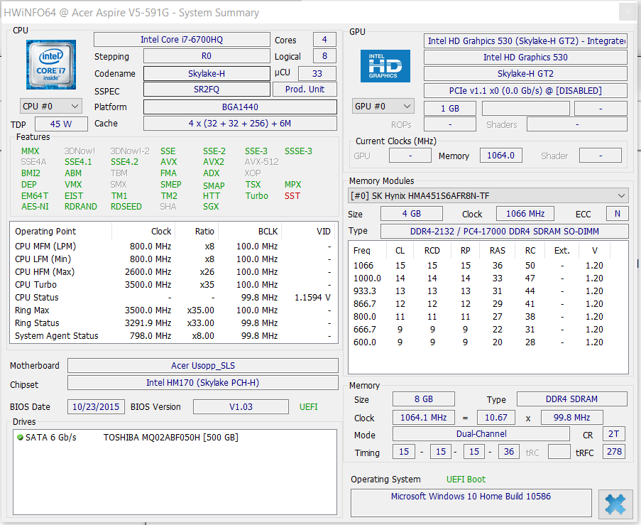 An Rechenleistung mangelt es dem Aspire nicht. Acer stattet den Rechner mit einem Core i7-6700HQ (Skylake) Vierkernprozessor aus. Die CPU gehört zur Oberklasse und verfügt über mehr als genug Rechenleistung für alle gängigen Anwendungsszenarien. Es handelt sich hierbei nicht um einen ULV-Prozessor (TDP: 15 Watt), sondern um einen herkömmlichen Mobilprozessor (TDP: 45 Watt). Die CPU arbeitet mit einer Basisgeschwindigkeit von 2,6 GHz. Per Turbo kann der Takt auf 3,1 GHz (vier Kerne), 3,3 GHz (zwei Kerne) bzw. 3,5 GHz (ein Kern) gesteigert werden. Vom Turbo wird auch reichlich Gebrauch gemacht. Im Netz- und Akkubetrieb arbeitet der Prozessor mit voller Geschwindigkeit.