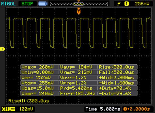 Das Display flackert mit 185 Hz (im schlimmsten Fall, eventuell durch Pulsweitenmodulation PWM) bei einer eingestellten Helligkeit von 90 % und darunter. Darüber sollte es zu keinem Flackern kommen. Die Frequenz von 185 Hz ist relativ gering und daher sollte es bei sensiblen Personen zu Problemen wie Flackern oder Augenbeschwerden führen. Im Vergleich: 53 % aller getesteten Geräte nutzten kein PWM um die Helligkeit zu reduzieren. Wenn PWM eingesetzt wurde, dann bei einer Frequenz von durchschnittlich 8125 (Minimum 5, Maximum 343500) Hz. | |||