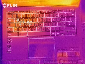 Das Chromebook ist völlig geräuschlos, es gibt keinen Lüfter. Die Temperatur steigt dennoch nicht exorbitant, wir messen maximal 37 Grad auf der Oberseite.