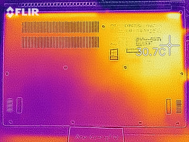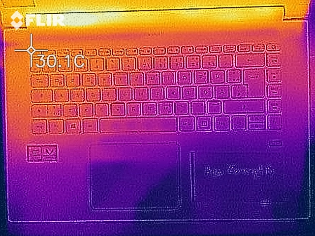 (+) Die Handballen und der Touchpad-Bereich sind mit gemessenen 29.7 °C kühler als die typische Hauttemperatur und fühlen sich dadurch kühl an.