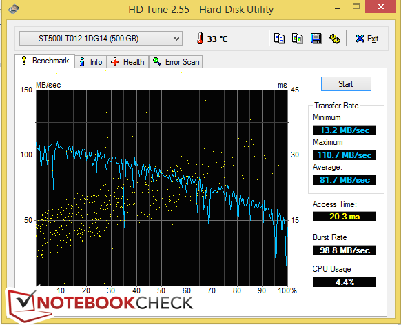 Für den nötigen Speicherplatz sorgt im Acer eine Seagate Momentus Thin Festplatte, welche mit 500 GB genügend Speicher zur Verfügung stellt. Im HDTune und Crystaldiskmark erzielt die Festplatte für ihren Typus ordentliche Ergebnisse. Die Vergleichsmodelle setzen ebenfalls auf die gleiche oder einer ähnlichen Baureihe.