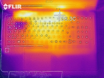 Unseren Stresstest (Prime95 und Furmark laufen für mindestens eine Stunde) durchläuft das Extensa im Netz- und im Akkubetrieb auf die gleichen Weisen. Der Prozessor geht mit 1,5 bis 1,6 GHz zu Werke. Der Grafikkern arbeitet mit 900 bis 1.000 Hz. Sonderlich stark erwärmt sich der Rechner nicht. Während des Stresstests liegen die Temperaturen an allen Messpunkten deutlich unterhalb von 40 Grad Celsius.