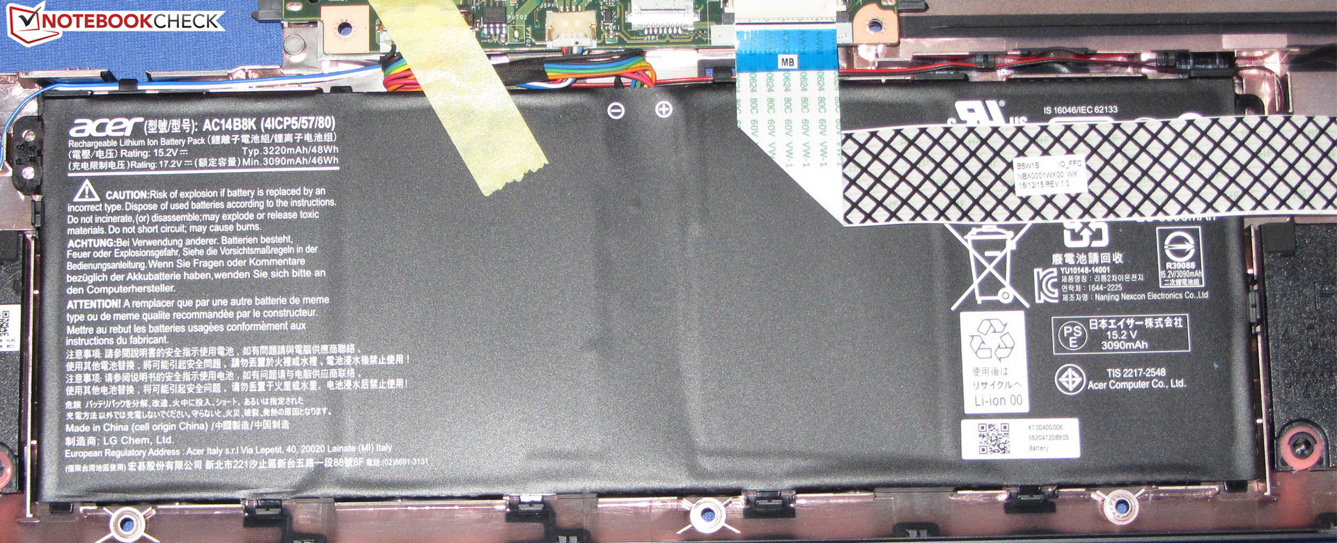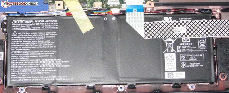 Auf der Unterseite des Rechners findet sich eine Wartungsklappe, hinter der sich die Arbeitsspeichermodule und die Solid State Disk befinden. Um an Komponenten wie den Akku und den Lüfter zu gelangen, müsste das Gehäuse geöffnet werden. Dazu werden als erstes das optische Laufwerk ausgebaut und die Wartungsklappe demontiert. Anschließend sollte die SSD ebenfalls ausgebaut werden, um diese nicht zu beschädigen. Nun werden alle Schrauben auf der Geräte-Unterseite entfernt. Danach wird das Notebook wieder auf seine Füße gestellt und die Oberschale der Baseunit mit Hilfe eines flachen Spatels oder eines Fugenglätters abgelöst. Hierbei muss vorsichtig vorgegangen werden: Da die Oberseite recht fest auf der Unterschale sitzt, können die sie haltenden Kunststoffklammern leicht abbrechen. Achtung: Die Oberschale ist über zwei Flachbandkabel mit der Baseunit verbunden. Nun hat man Zugriff auf den Akku, den Lüfter und das WLAN-Modul.