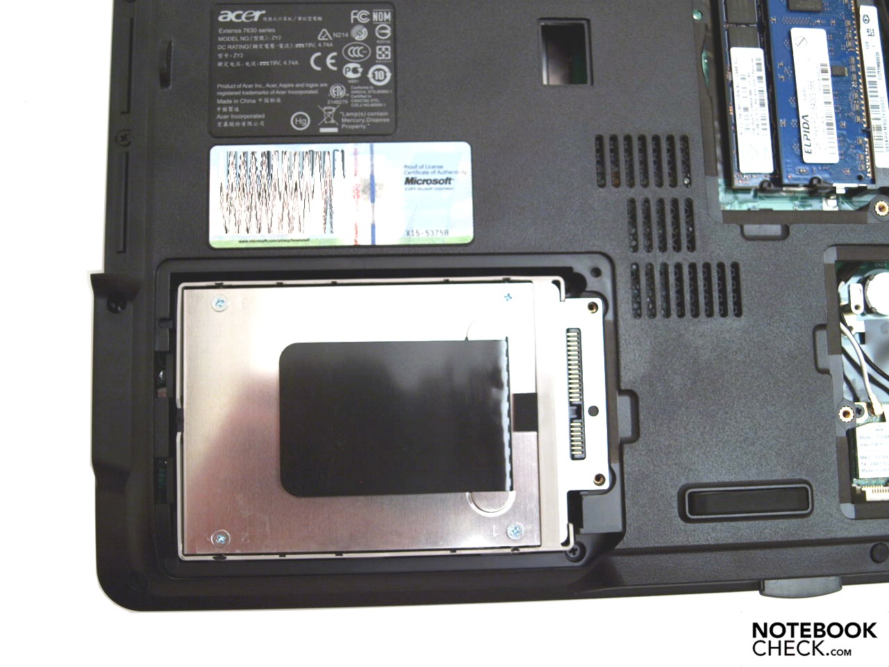 Diesen stehen die beiden DDR2 RAM-Bausteine einmal 2 Gigabyte und einmal ein Gigabyte) zur Seite, also insgesamt 3 Gigabyte. Maximal unterstützt der PM45 Chipsatz bis zu 8Gigabyte RAM betrieben werden, Acer bietet aber nur bis zu 4 Gigabyte an. Über eine Wartungsklappe an der Unterseite kann zudem auch ein Laie problemlos ein RAM-Upgrade durchführen.