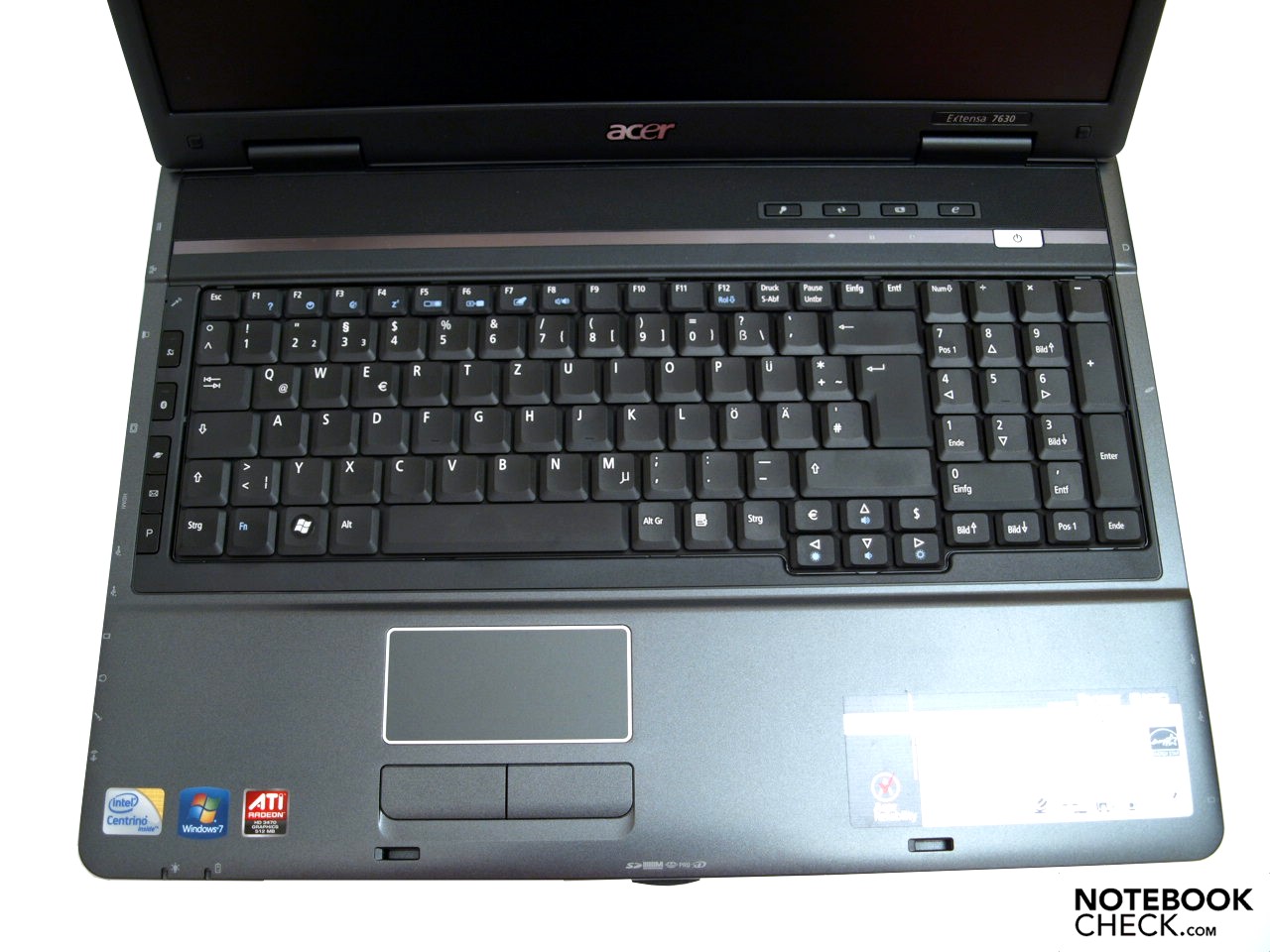 Die Tastatur des Acer Extensa 7630G-653G25MN Notebooks verfügt über einen eigenständigen numerischen Tastenblock und gleicht somit im Handling einer herkömmlichen Standardtastatur. Die Tastengröße mit 17x17mm bei einer Abschrägung vom 2mm entspricht den herkömmlichen Abmessungen. Funktions- und Schnellstarttasten finden sich zum einen im Bereich des rechten Lautsprechers, zum anderen am linken Seitenrand neben der Tastatur