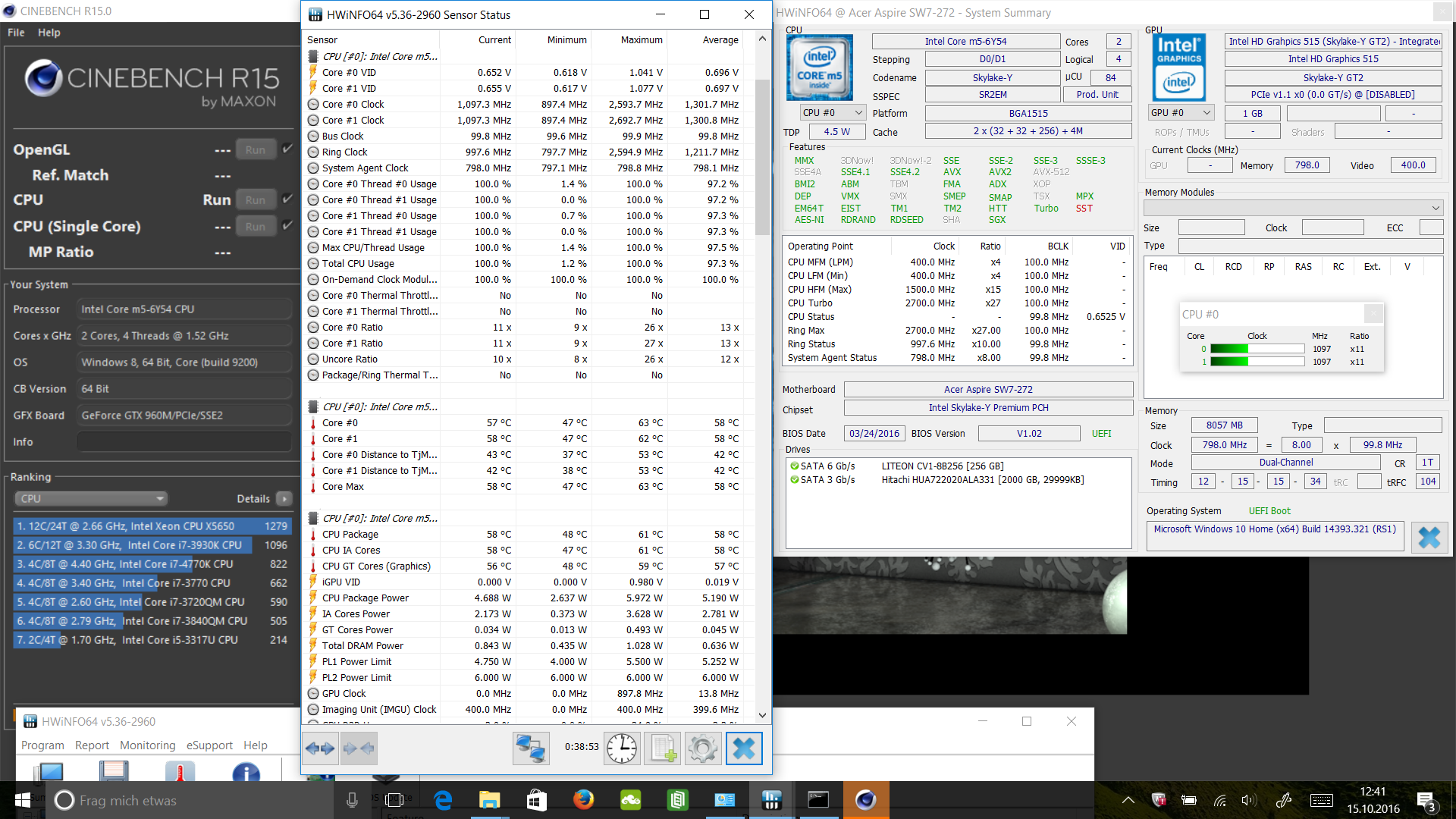 Nadelöhr-Prozessor: Das Switch 12S konnte seinerzeit im Test mit Core m3 6Y30 1,5 bis 1,6 GHz (Multi-Thread) bzw. 2 bis 2,2 GHz (Single-Thread) fahren. Diese Werte wurden auch bei fünffachem Durchlauf der Tests gehalten. Das war nun der Core m3. Im vorliegenden Switch 12S werkelt ein Core m5 6Y54 (1,1 GHz) und der beackert den Cinebench R15 Multi-Test nur mit 1,3 bis 1,4 GHz. Das liegt zwar in der Turbo-Range, ist aber weit unter den möglichen 2,7 GHz. Die Leistung verschlechtert sich bei konstanter Belastung – wie sie auch bei Games der Fall ist. Nach 10 Minuten lagen im Multi-Test nur noch 1,0 bis 1,1 GHz an, Throttling setzte also ein (bei 62 Grad am SoC).
