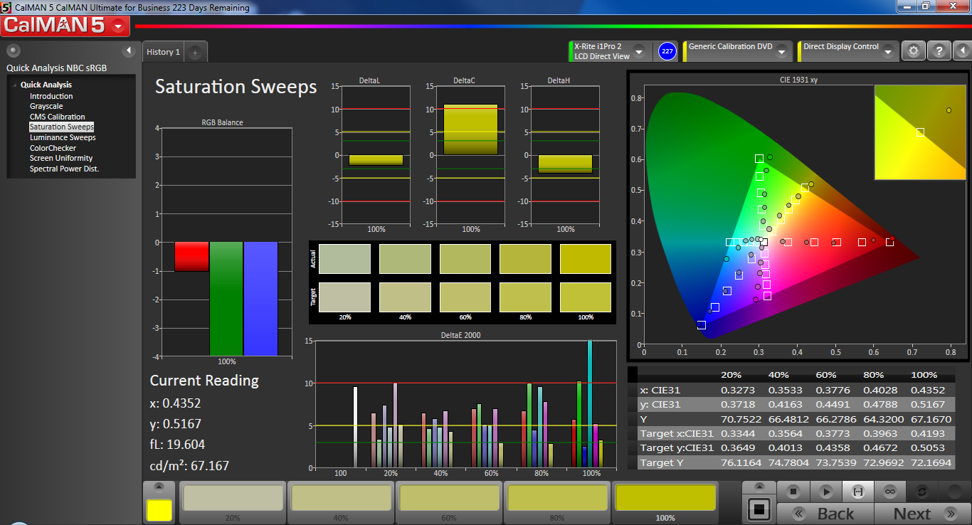 Bei den einzelnen Farbmessungen zeigt sich eine interessante Verschiebung bei den grünen und türkisen Farben. Dies könnte auf das RGBCYW Farbrad zurückzuführen sein. Die Farbabweichungen sind mit dem durchschnittlichen DeltaE 2000 von 6 noch im akzeptablen Bereich. Nur einzelne Werte überschreiten den kritischen Messwert von 10. Auch nach dem automatischen Kalibrieren mit dem i1Profiler wird das Ergebnis jedoch nicht deutlich besser.
