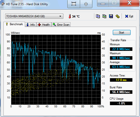 HD-Tune (64 MB/s Lesen) und Crystal Disk Mark 3.0 (68 MB/s Lesen/Schreiben) bescheinigen der vorliegenden Toshiba MK6465GSX (640 GB) eine allenfalls durchschnittliche Lese-und Schreib-Geschwindigkeit. Der Crystal Disk Mark 3.0 liegt höher, was durch eine andere Test-Routine erklärt werden kann (zirka 5-10 MByte/s Differenz ist immer vorhanden). Die Burst Rate ist mit 56 MB/s gering, was für einen langsamen Cache der HDD spricht. Die ermittelten Datendurchsätze knapp unter dem Durchschnitt für 2.5-Zoll HDDs mit 5.400 rpm.