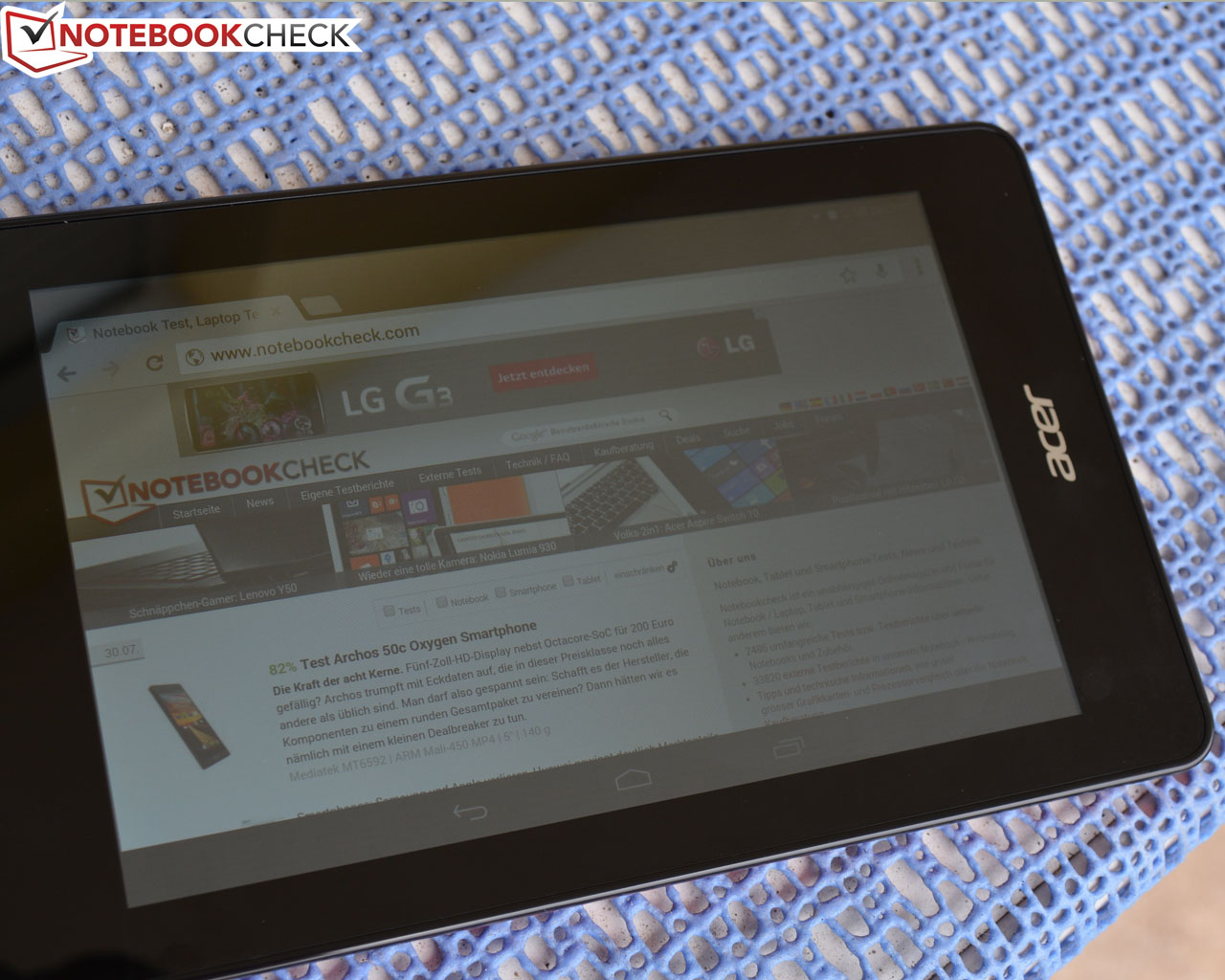 Über WLAN lässt sich mit dem Acer Iconia One 7 bei angepasster Helligkeit von 25 Prozent (150 cd/m²) fast 7 Stunden lang surfen. Das Medion LifeTab S7852 erreicht hier nur marginal mehr (7:24 Stunden), das HP Slate 7 Plus 4200ef (6:40 Stunden) sowie der hauseigene Vorgänger Iconia B1-721 (4:17 Stunden) verlangen schon früher nach einer externen Stromversorgung. An den Marathonsurfer Lenovo A8-50 mit 9:20 Stunden kommt das Testgerät nicht heran. Ein ganzer Arbeitstag ohne Lademöglichkeit ist damit also kaum machbar.