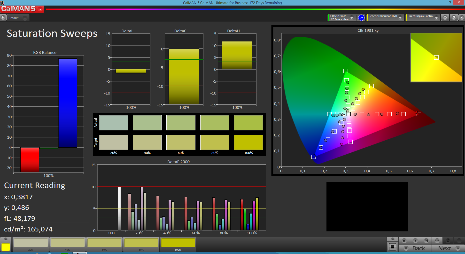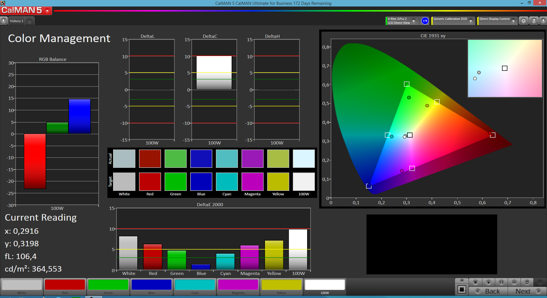 Unsere Messungen mit CalMAN zeigen im Rot- und Blau-Bereich nur leichte Abweichungen von der Norm, was das durchschnittliche DeltaE von 5,79 unterstreicht. Das Farbmanagement offenbart einen marginalen Blaustich in der Farbskala. Auch die Graustufen zeigen einen sichtbaren Blaustich. Dabei fällt das Gamma von 2,53 gut aus, die Farbtemperatur von 7.776 K ist etwas zu hoch. Im Alltagsbetrieb fallen diese Defizite nicht störend auf, sodass man davon im Betrieb wenig merkt.