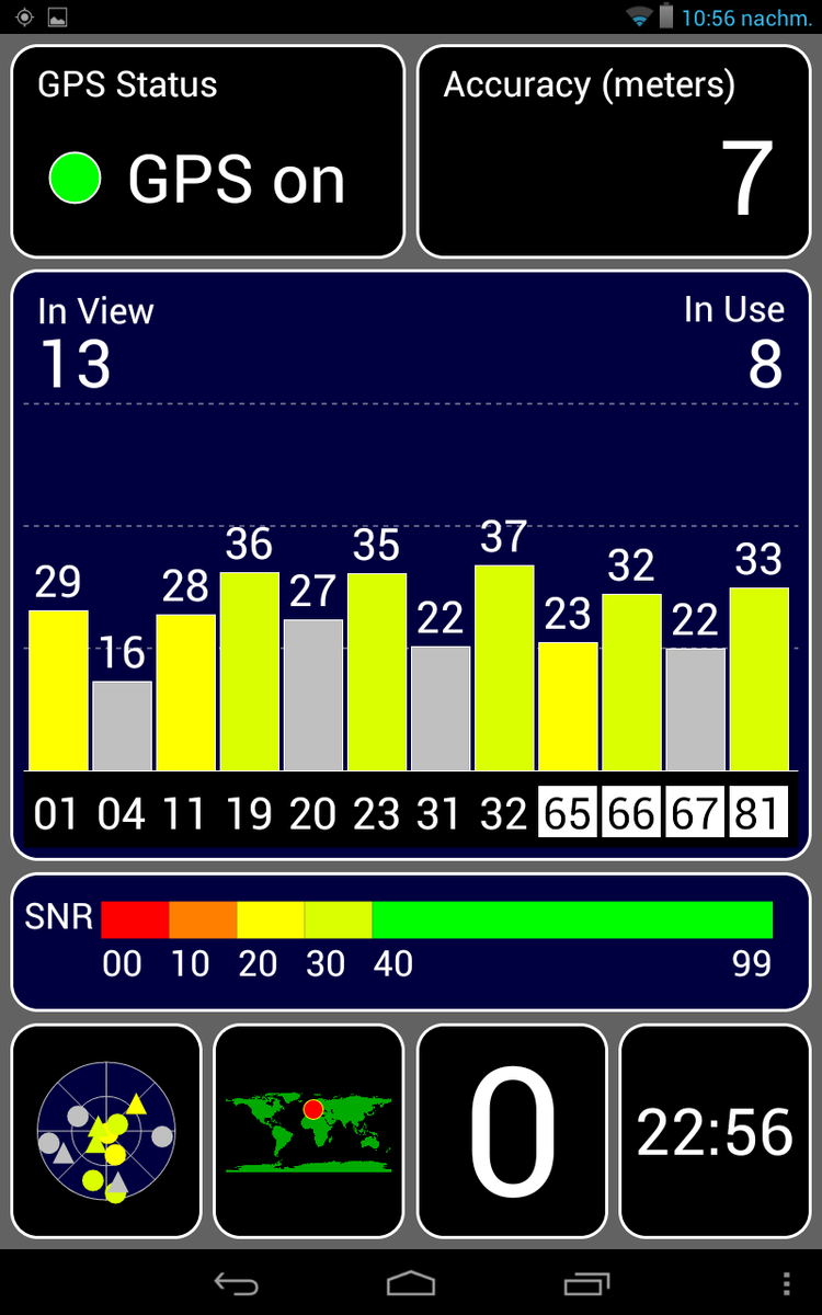 Zudem steht ein GPS-Modul parat, das im Test mit der App GPS-Test erst nach mehreren Minuten unter freiem Himmel ein ordentliches Signal fand. Dann jedoch blieb selbiges stabil und das Tablet konnte sich in mehrere Satelliten mit einer guten Genauigkeit einbuchen. Als Navigationslösung ist das Testgerät also bedingt geeignet.