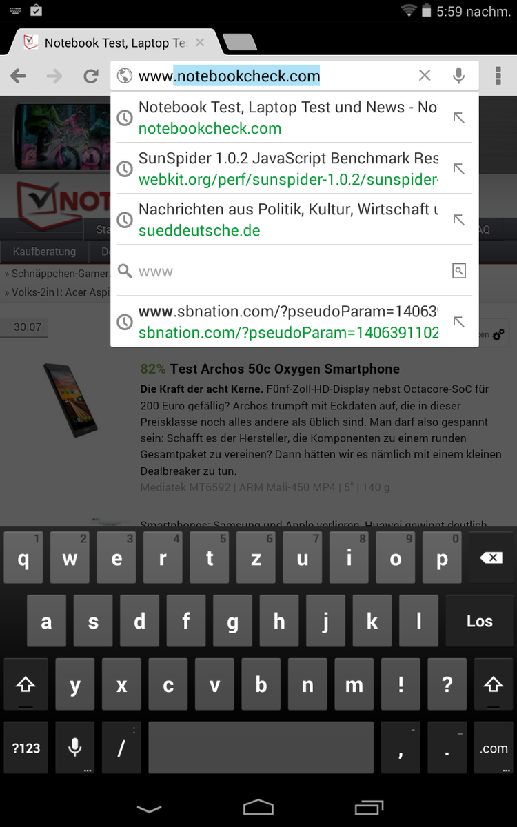 Bei den browserbasierten Benchmarktests liefert das Acer Iconia One 7 B1-730 im Klassenvergleich eine hervorragende Vorstellung ab und düst den meisten Mitbewerbern davon. Nur das Medion LifeTab S7852 sowie das Lenovo A8-50 können da noch mithalten. Dieser Leistungsvorsprung wird jedoch etwas relativiert, da das Testgerät ab Werk bereits auf den schnellen Browser Google Chrome setzt, während viele Mitbewerber mit dem langsameren Android-Browser getestet wurden. Im Alltagsbetrieb begeistert das Surfen mit einem flotten Seitenaufbau.
