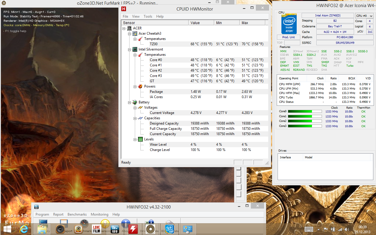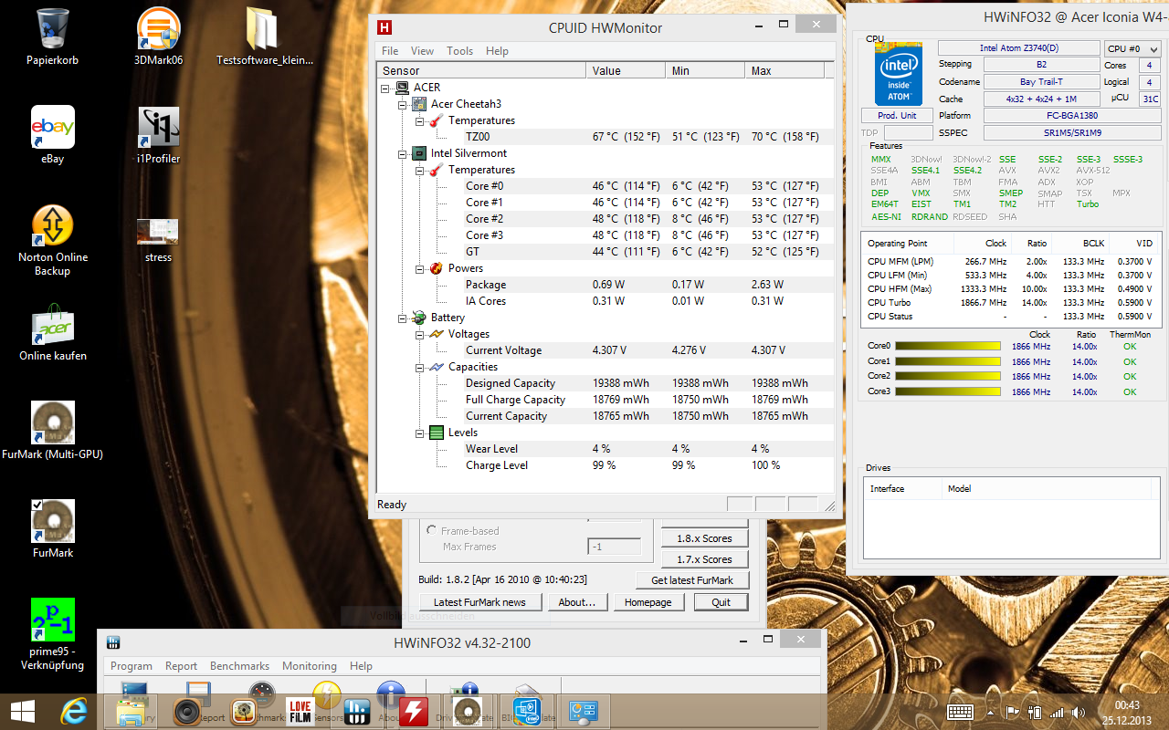 Mit einem Stresstest aus Prime95 (CPU) und Furmark (GPU) prüfen wir die höchstmögliche Abwärmebelastung und die CPU-Taktungen währenddessen. Der Test beginnt mit 1,86 GHz, schnell steigt die Temperatur am Prozessor zu stark an, weshalb Throttling einsetzt. Der Takt fällt auf 1.199 MHz und schwankt bei fortwährender Belastung bis auf 1.333 MHz (47-49 %). Das ist nach einer Stunde auch noch so. Bei den obigen Leistungstests trat ein solches Verhalten nicht auf, weshalb das Iconia W4 typische Werte in den CPU-Benchmarks erzielte.