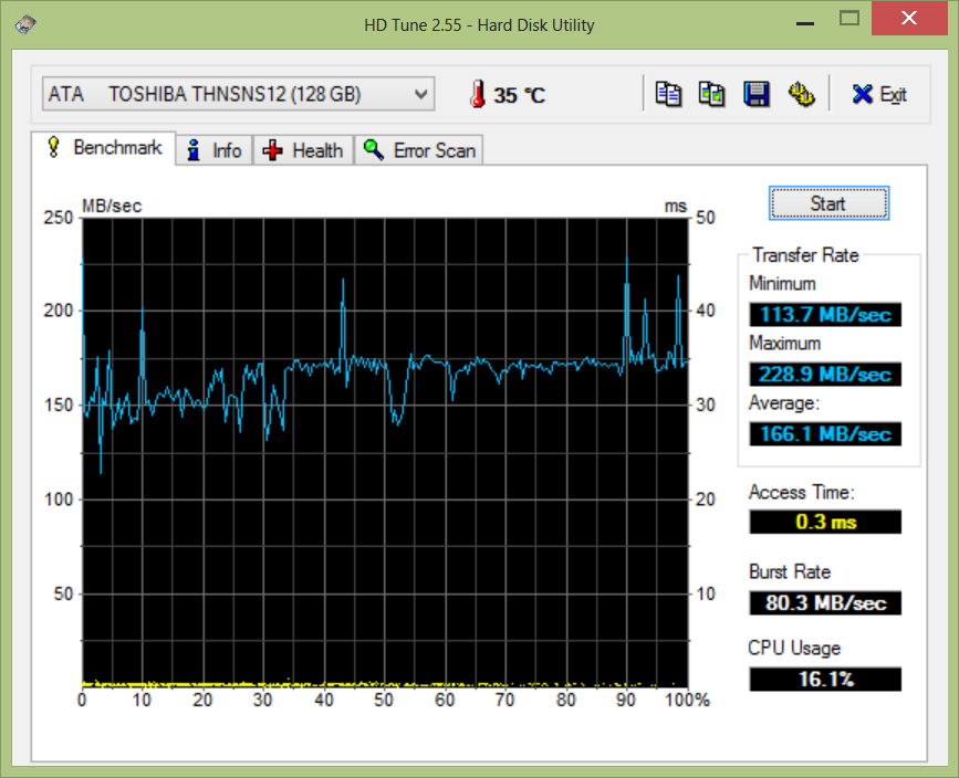 Zum Einsatz kommt ein Solid State Drive (SSD) aus dem Hause Toshiba mit der Bezeichnung THNSNS128GMCP. Die Festplatte ist mittels eines 6 Gbit-SATA-Kontroller angebunden und bietet nominell Platz für 128 GB Daten. Bei der ersten Inbetriebnahme waren davon 89 Gigabyte verfügbar. Dies scheint erst nicht viel, doch kann die nicht benötigte vorinstallierte Software gelöscht werden, da diese notfalls noch auf DVD verfügbar ist. Windows 8 selber benötigt 18,5 GB auf der Partition.
