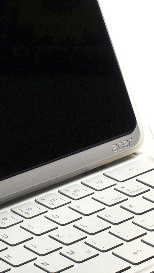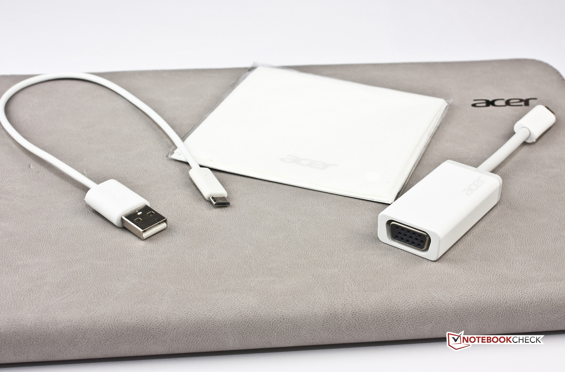 Neben dem Smart-Cover mit einer integrierten Bluetooth-Tastatur liegt ein TÜV und GS geprüftes 65 Watt-Netzteil aus dem Hause LiteOn bei. Außerdem gibt es einen Adapter von Mikro-HDMI auf VGA sowie ein Ladekabel für die Tastatur. Die Bluetooth-Tastatur verfügt über einen Mikro-USB-Anschluss, mit dem Kabel kann dieses direkt an den USB-Anschluss des Iconia angeschlossen werden.