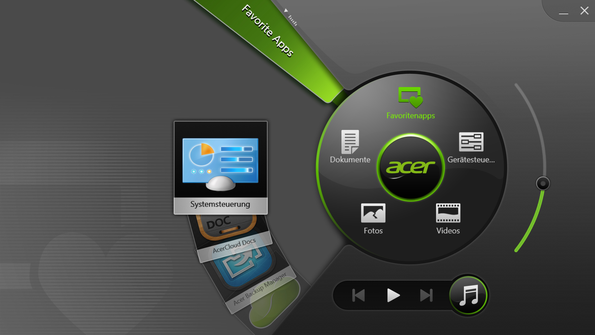 Im Tablet kommt ein kapazitiver Touchscreen zum Einsatz, sodass Berührungen und Gesten auf dem Display ohne Druckaufwand umgesetzt werden. Der Multi-Touchscreen erkennt bis zu zehn Finger gleichzeitig. Acer liefert direkt ein praktisches Tool mit, das sich dies zu Nutzen macht: AcerRing. Tippen fünf Finger gleichzeitig auf den Bildschirm startet das Programm, das einen unter anderem den Schnellzugriff auf Dokumente, Fotos und die meist genutzten Apps bietet. Zu dem befindet sich darin die Möglichkeit in der Gerätesteuerung die Kommunikationsmodule sowie den Helligkeitssensor schnell und unkompliziert ein und aus zu schalten. AcerRing ist durch seine touch-optimierte Oberfläche eine sinnvolle Eingabeergänzung.