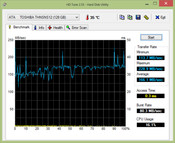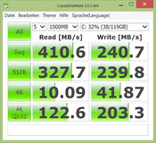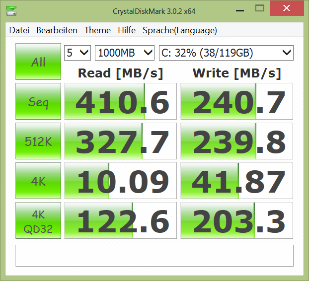 Im Sony Vaio Duo 11 ist die gleiche Festplatte verbaut, sodass die Transferraten beinahe identisch sind. Anders sieht der Vergleich mit der 64 GB SSD im Samsung Series 7 Tablet aus, diese ist gerade mal halb so schnell beim sequenziellen Lesen und Schreiben und bricht beim 4K-64 Write mit 35.67 MB/s etwas ein.