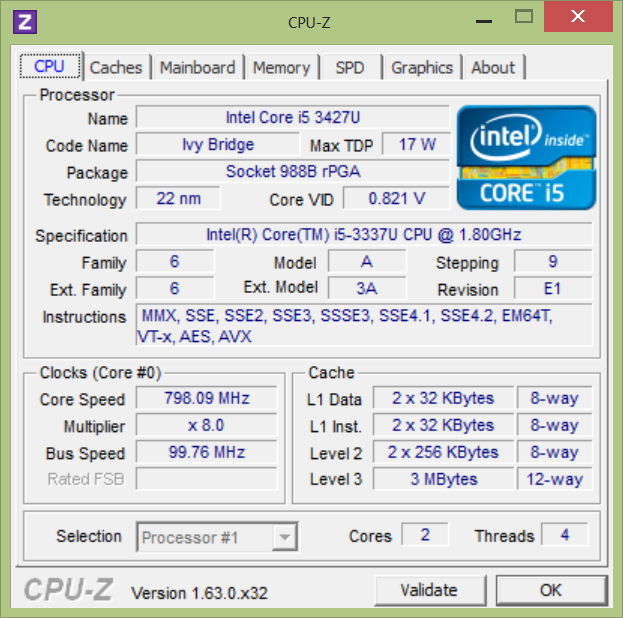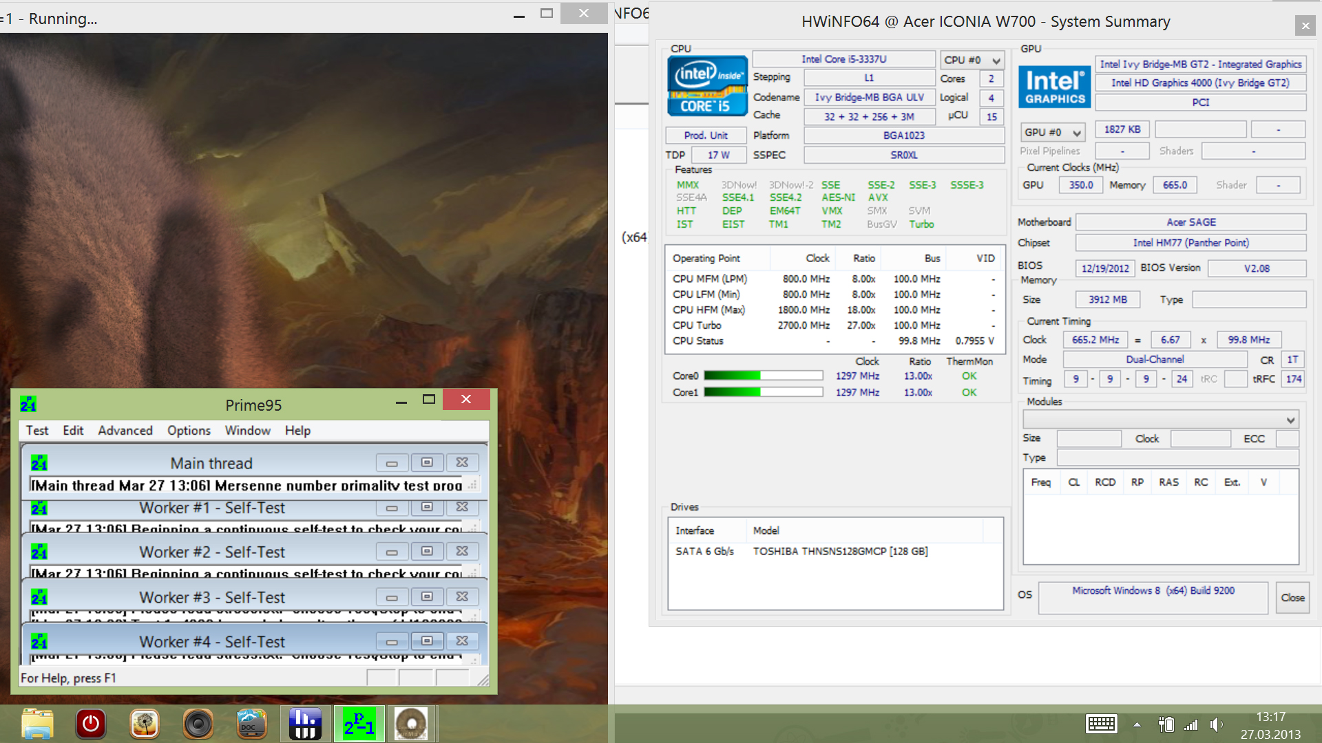 Das Acer Iconia W700 ist mit einem Core i5-3337U von Intel ausgestattet. Diese Dual-Core-Prozessoren sind wegen ihres relativ niedrigen Stromverbrauchs häufig in Ultrabooks verbaut, wie dem Dell XPS 13 L322X oder dem Sony Vaio SV-T1511M1E/S. Bei allen Geräten wurde der gleiche i5-Doppelkernprozessor verwendet, ein 22-nm-Ivy-Bridge-ULV-CPU mit 17 Watt TDP, womit diese etwa halb so viel Strom benötigen wie die Standardprozessoren. Der ULV-i5-CPU verfügt über einen 3.072 KB großen L3-Cache, vier Threads und einen potenziellen Boost bis zu 2.700 MHz. Er arbeitet mit einem Basistakt von 1.800 MHz und einem Idle-Takt von knapp 800 MHz im Energiesparmodus. Weiter kommt das Tablet mit 4GB Dual-Channel DDR3 RAM daher.