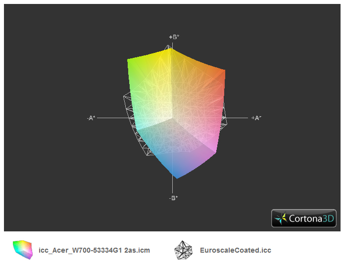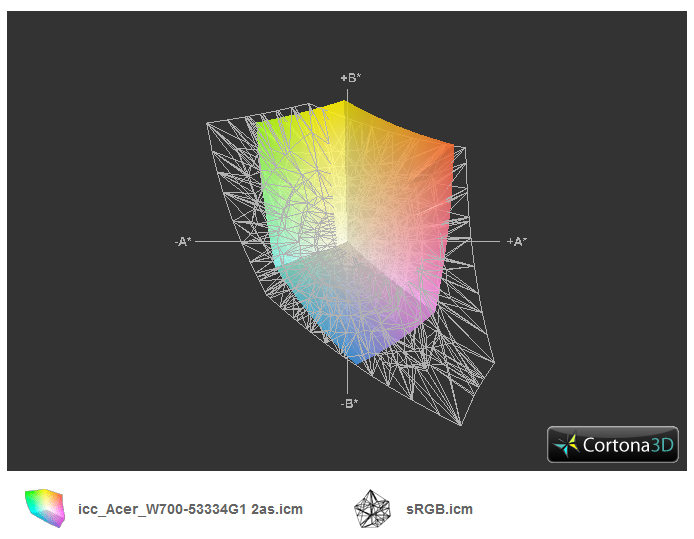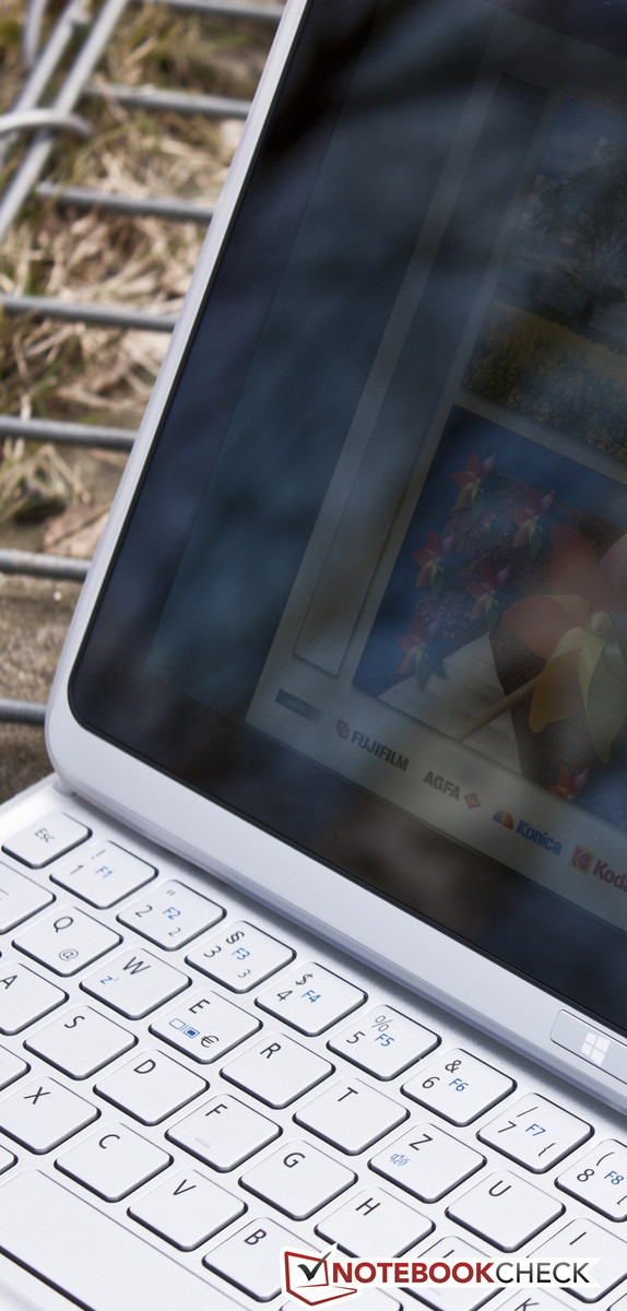 Bei einer technisch tiefer gehenden Untersuchung bestätigt sich der gewonnene erste Eindruck des Displays. Mit einem Kontrast von 963:1 liefert das Acer Iconia W700 einen sehr guten Wert ab. Die Helligkeit wird in der Displaymitte mit 378 cd/m² gemessen, was ebenfalls gut, wenn auch nicht überragend ist. Im Akkubetrieb schafft das W700 mit Licht auf dem Helligkeitssensor, der die Leuchtkraft des Panels regelt, maximal 281 cd/m². Ein eher ernüchternder Wert. Die gemessenen Weißwerte liefern hinsichtlich Farbtemperatur einen Mittelwert von 6.529 K, was sich ganz knapp um das Optimum von 6.500 K bewegt.
