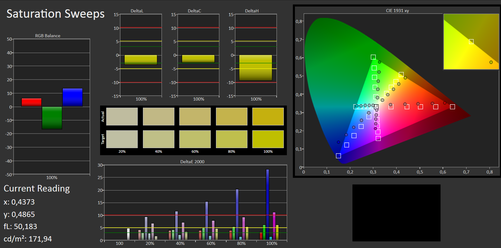 Die Grauwerte bleiben ebenfalls in einem guten Rahmen. Den größten Ausreißer gibt es bei einer Helligkeit von 90% mit einem Wert von 5,0. Der Gamma-Wert ist im Durchschnitt mit 2,3 in Ordnung und hat keine größeren Ausreißer. In puncto Farbtreue schwächelt das Display bei Blau und Magenta, was dadurch wie Flieder wirkt. Der DeltaE von Blau kratzt schon beinahe an der 30er Marke. Bei der Farbsättigung es ebenfalls diese beiden Farbtöne, die negativ herausstechen.