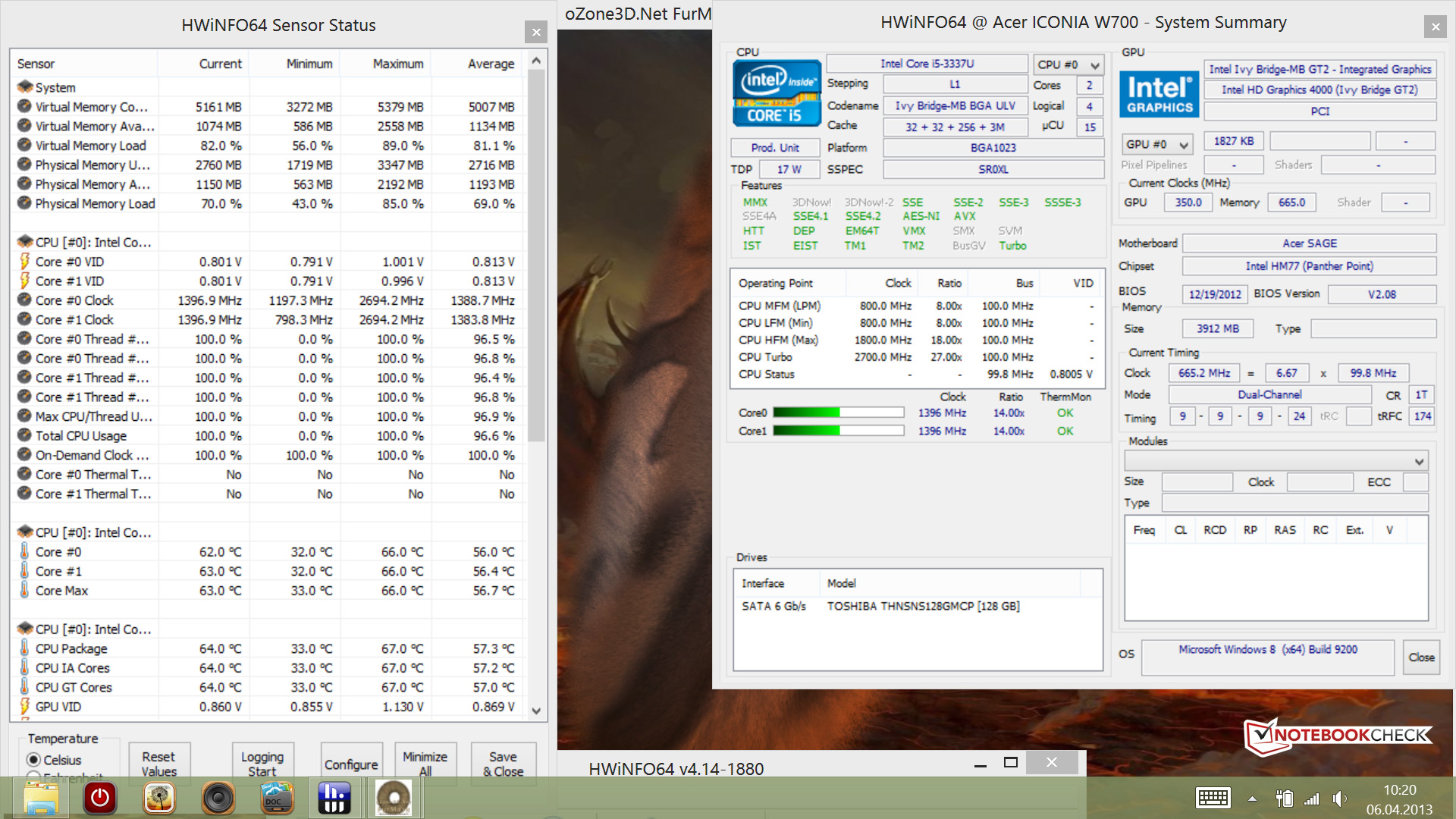 Im Stresstest der Grafikkarte wird schnell klar warum. Zum Start von FurMark sprintet die HD 4000 auf 1.100 MHz, fährt dann aber relativ schnell wieder auf eine Taktfrequenz von 850 bis 900 MHz zurück. Dies änderte sich auch im Akkubetrieb nicht, der Takt bleibt unverändert, jedoch wird dann die CPU auf 900 MHz gedrosselt. Acer setzt hier ganz klar seine Prioritäten auf einen sparsamen Energiehaushalt und nicht auf Leistung.