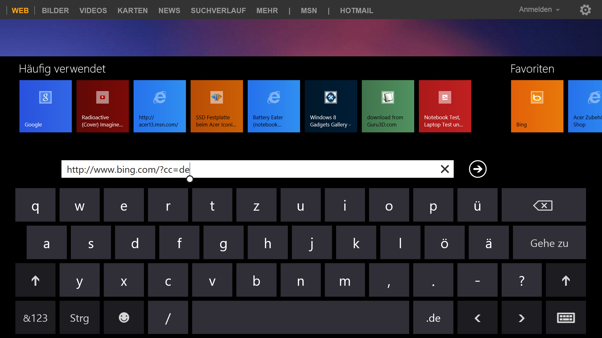 Die virtuelle Tastatur von Windows 8 ist gewohnt übersichtlich und reagiert ohne Verzögerungen. Durch das große Display sind auch die Tasten entsprechend groß, weshalb auch Anwender mit breiteren Finger keine Probleme haben sollten. Kleinere Texte oder Chats lassen sich auch bequem über den Touchscreen eingeben. Die Eingabegenauigkeit des Displays weiß zu überzeugen, weshalb sich auch auf dem Desktop gut mit den Fingern arbeiten lässt.