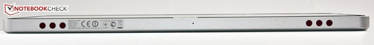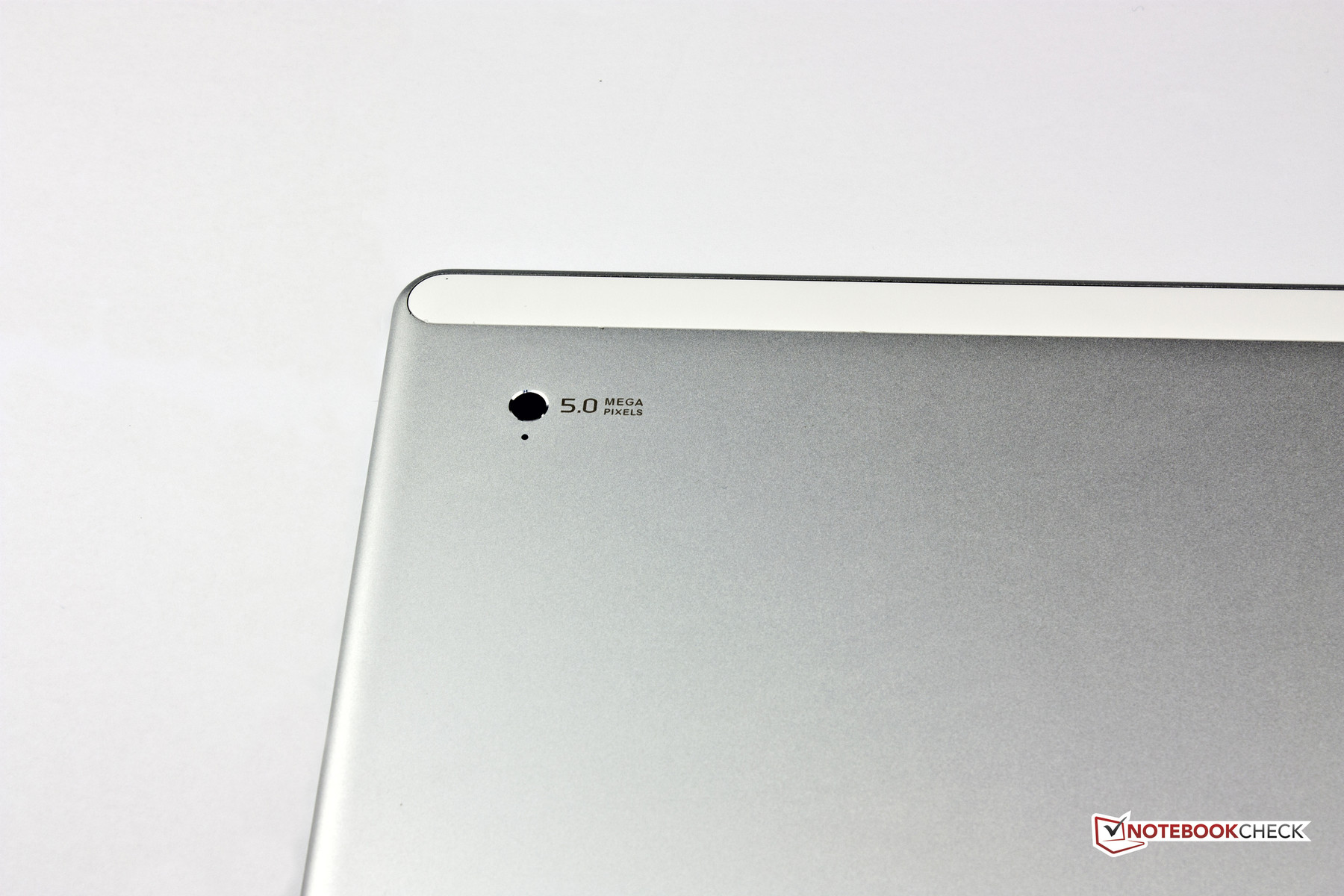 Die Vorderseite nimmt größtenteils der 11,6 Zoll große Touchscreen ein. Umrahmt wird er von einem 17 mm breiten schwarzen Rahmen, der das Display im ausgeschalteten Zustand größer wirken lässt. Darin befinden sich die 1,3 Megapixel (MP) Webcam und der Helligkeitssensor. Die Kehrseite zeigt sich vollständig im silberfarbenen Aluminium-Look, unterbrochen durch einen dicken Gummistreifen, der den Zugang zu den Wartungsschrauben abdeckt. Außerdem befindet sich auf der Rückseite eine 5 MP Kamera. Neben beiden Kameras befinden sich kleine eingelassene LEDs, die grün leuchten, wenn die jeweilige Kamera aktiv ist.