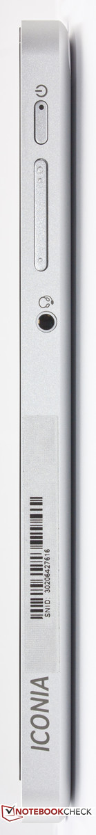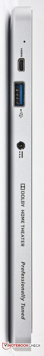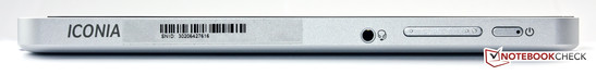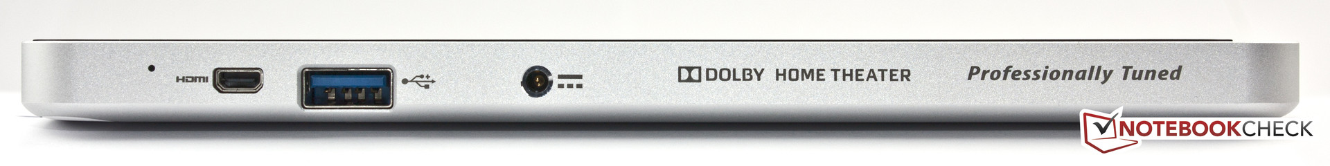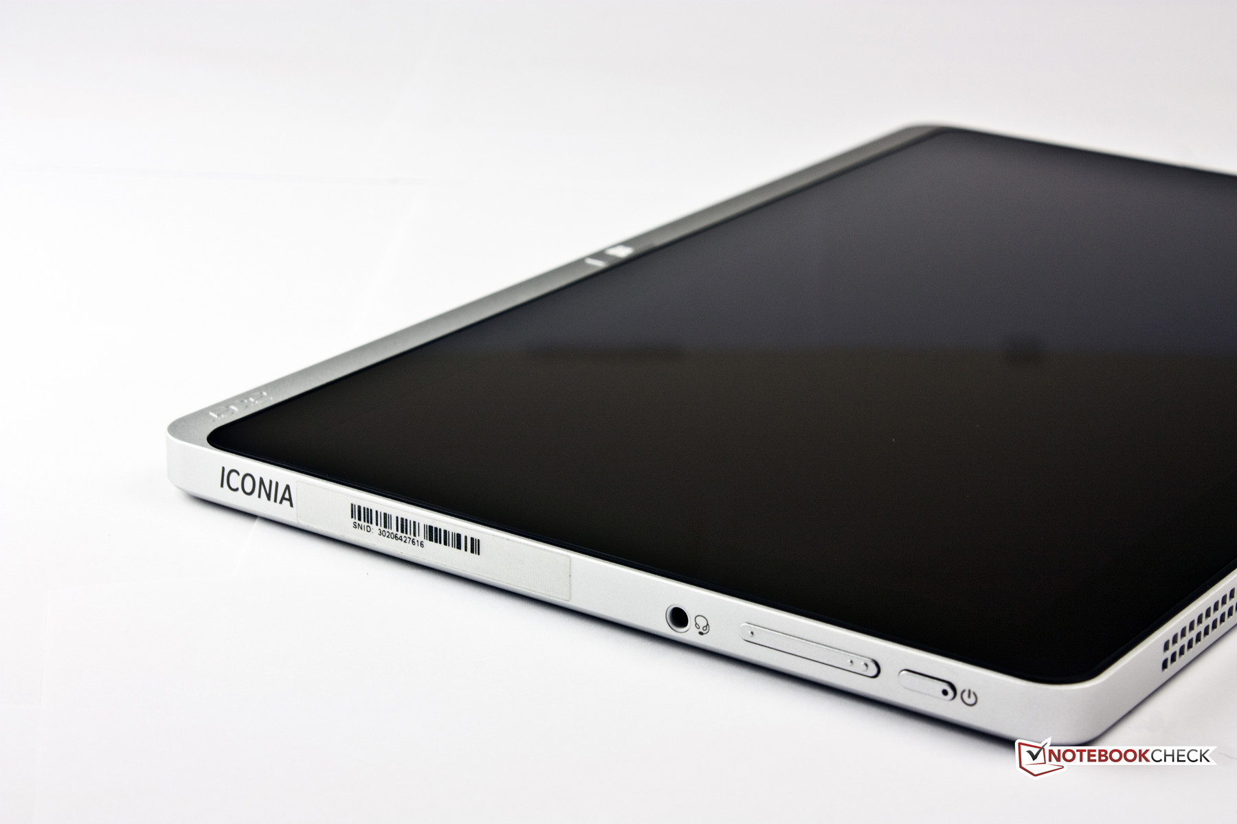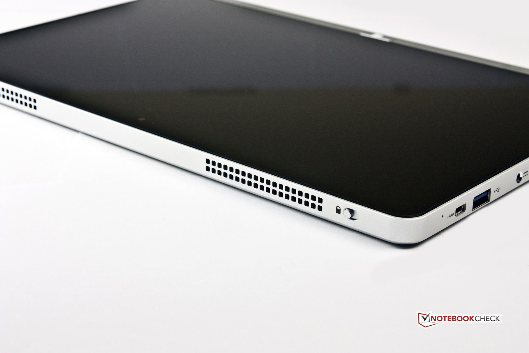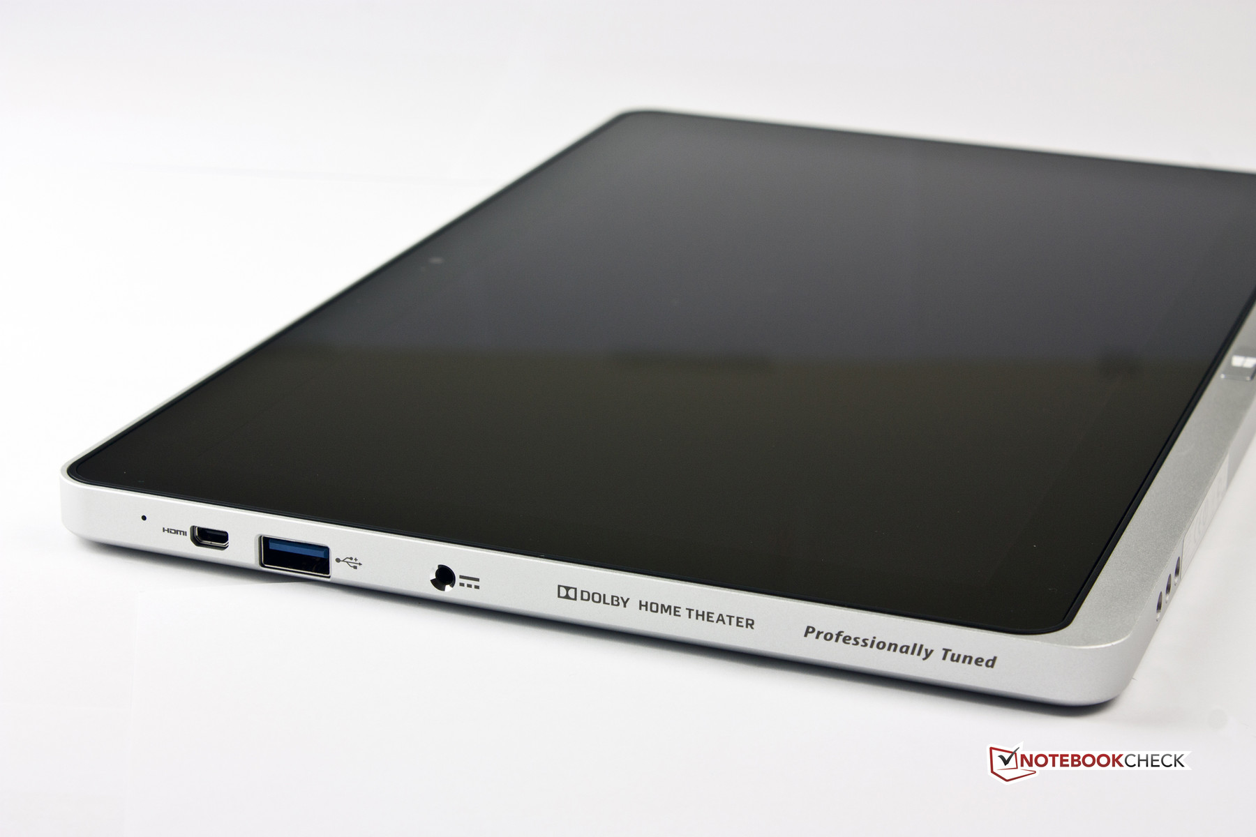 Die Anschlüsse des Acer Iconia W700 sind übersichtlich, nicht nur in ihrer Anordnung, sondern auch anhand ihrer geringen Anzahl. Links vom Display befindet sich ein Steckplatz für das mitgelieferte 65W AC-Netzteil. Darüber angeordnet befinden sich ein USB-3- und ein Micro-HDMI-Anschluss. Auf der Gegenseite sind ein kombinierter 3,5-mm-Soundausgang/Mikrophoneingang und der Powerknopf sowie eine Lautstärkewippe angebracht. Auf der Oberseite sind die Auslasse für die Lüfter zu finden, außerdem ein Rotation-Lock-Schalter. Erfreulich ist, dass der USB-Port genügend Spannung für 2,5-Zoll-Festplatten liefert. Schön wären ein weiterer USB-Anschluss und ein MicroSD/SD-Karten-Steckplatz gewesen, das macht das Sony Vaio Duo 11 SV-D1121X9EB besser. Ein entsprechender Stylus für das Tablet kann separat erworben werden.