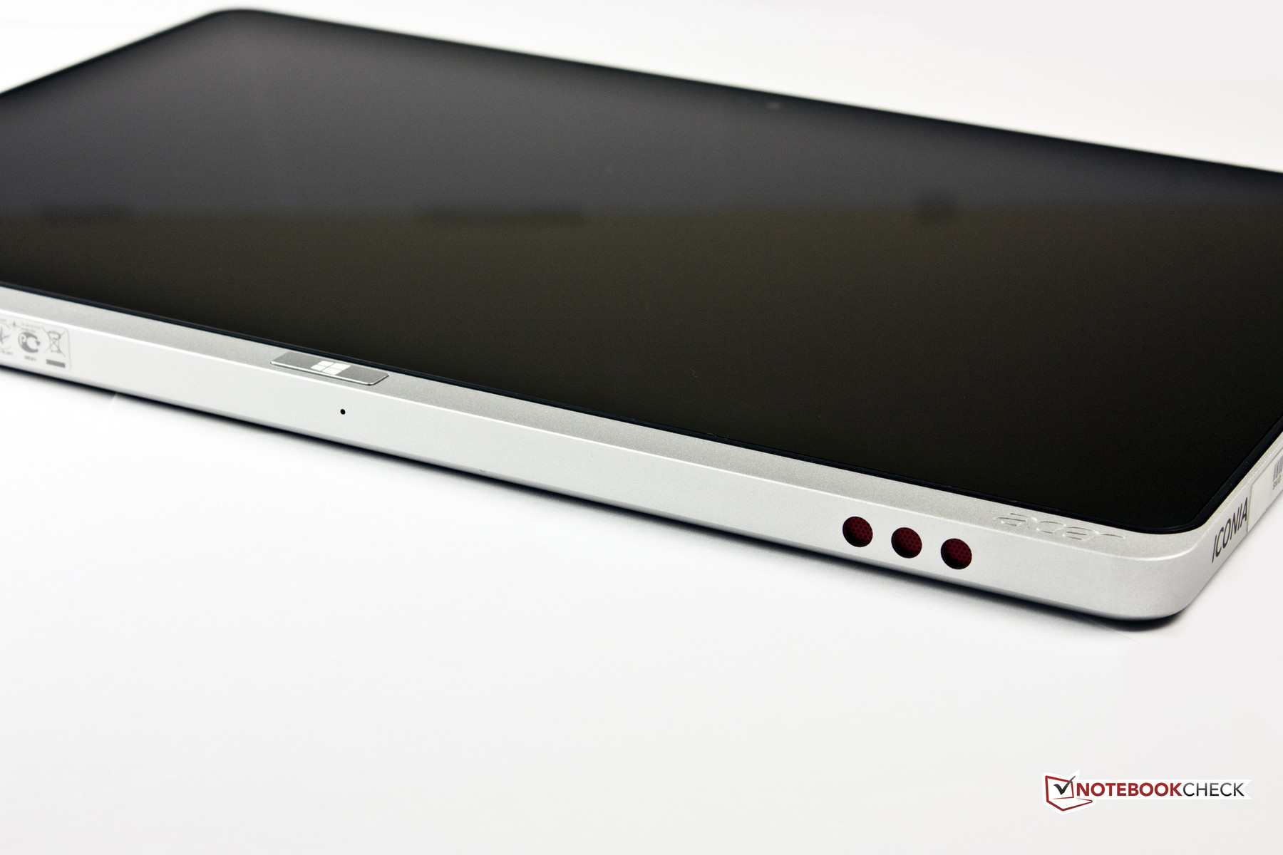 Acer bewirbt sein Produkt damit, dass es mit Dolby Home Theater v4 Technologie ausgestattet ist, was für einen besonders guten Klang sorgen soll. Als Basis dienen dafür an der Unterseite zwei Stereo-Lautsprecher. In der Tat überrascht der Klang mit einer klaren und vollen Akustik. Bässe lassen sich nicht wahrnehmen, was bei dem fehlenden Klangkörper nicht verwundert. Selbst bei voller Lautstärke wissen die beiden Lautsprecher zu überzeugen. Nur deren Position ist nicht immer optimal. Wird das Tablet auf dem Schoß abgestützt, können die Lautsprecher verdeckt werden und dadurch dumpfer klingen. Hörbar bleiben sie aber jeder Zeit.