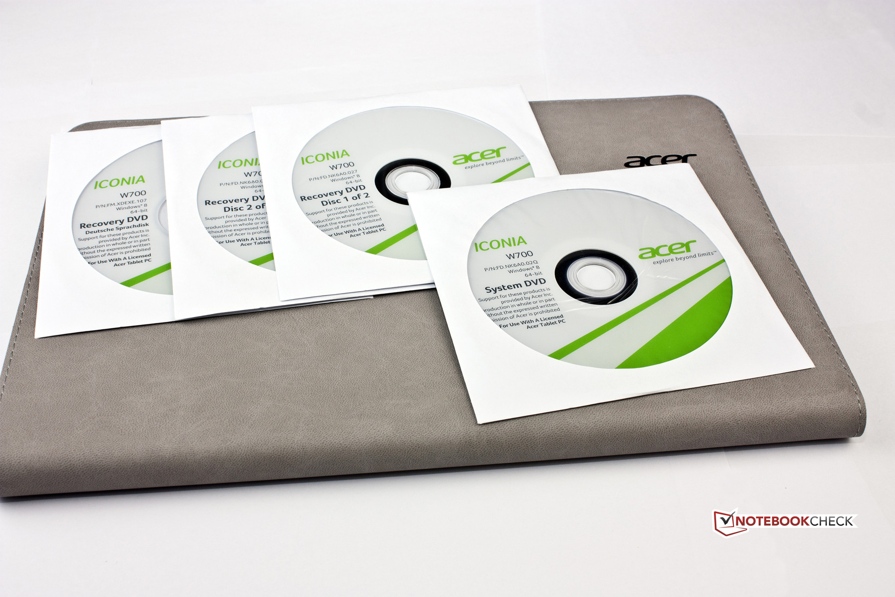 Neben zwei verschiedenen mehrsprachigen Kurzanleitungen befinden sich auch vier DVDs im Lieferumfang: Eine System-DVD mit Windows 8 64-bit, zwei Recovery-Datenträger und eine weitere Scheibe mit dem deutschen Sprachpack. Der Vorteil der beigelegten Datenträger ist, dass lediglich 400 MB auf der SSD für eine Recovery Partition verschwendet werden. Diese könnte man löschen, um zusätzlichen Speicher zu gewinnen. Dafür wird dann ein externes optisches Laufwerk benötigt, sollte Windows 8 einmal neu installiert werden müssen.