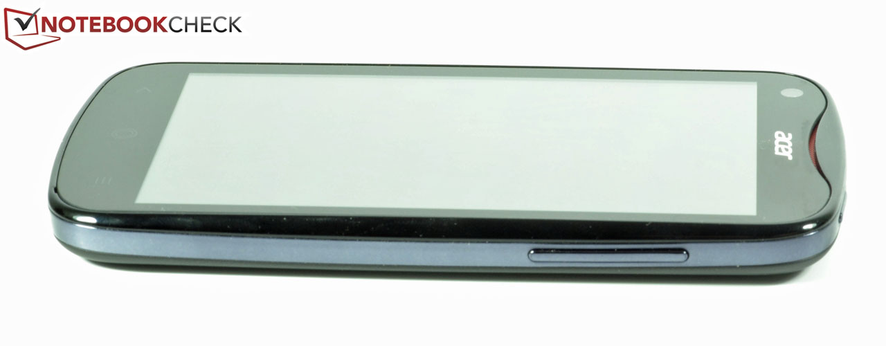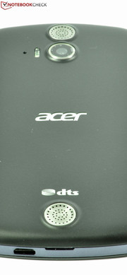 Das Gehäuse des Testgerätes wird wie beim kleinen Bruder Acer Liquid E1 Duo aus Polycarbonat gefertigt. Das Acer Liquid E2 Duo ist neben der hier getesteten matt-schwarzen auch in einer weißen Variante zu haben. Das Chassis wurde mit einer Gummierung überzogen, die die Haptik verbessert und verhindert, dass es zu leicht aus der Hand gleitet. Das schöne Design des Acer Liquid E1 Duo ist nur leicht verändert worden und gefällt auch beim Acer Liquid E2 Duo. Leider gibt die Displayschutzscheibe des IPS-Panels unter Druck immer noch etwas nach und zeigt dann Verfärbungen auf dem Touchscreen. Auch die Verwindungssteifigkeit des Gehäuses könnte besser sein, selbst wenn es beim Verwindungstest kaum Knarzgeräusche gibt. Das Back Cover des Testsamples sitzt zudem etwas fest. Insgesamt hat sich die Verarbeitung im Vergleich mit dem Acer Liquid E1 Duo deutlich verbessert. Auch die Spaltmaße sind jetzt nahezu durchgehend gleichmäßig. Unter der Abdeckung befinden sich neben einem 7,4-Wh-Akku noch beide SIM-Kartenslots und der Einschub für microSD-Karten. Die Abmessungen des Acer Liquid E2 Duo sind im Vergleich zum E1 Duo sogar minimal geschrumpft auf 68 x 131 mm bei gleicher Dicke von 9,9 mm. Mit einem Gewicht von 140 g ist das Testgerät also kein sehr kompaktes und leichtes Gerät; trotz des großen 4,5-Zoll-Displays wirkt es subjektiv aber recht handlich.