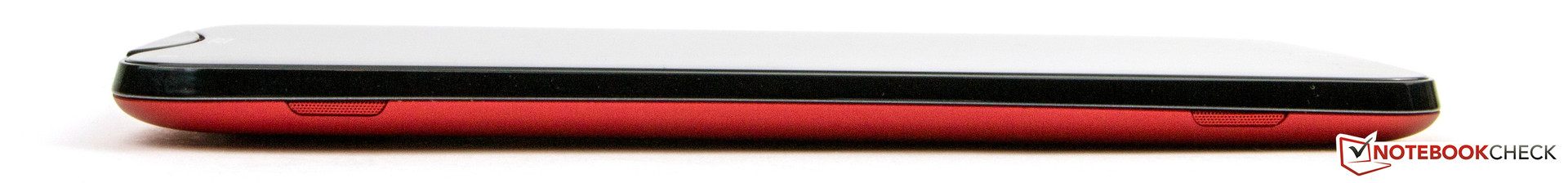 Die sogenannten Dual-Lautsprecher des Acer Liquid S2 sind auf der linken Gehäuseseite verbaut. Die Positionierung ist recht gut gelungen. Selbst wenn mit einer Hand einer der Lautsprecher abgedeckt wird, ist der Klang immer noch gut zu vernehmen. Ebenso kann das Gerät ruhig flach auf den Tisch gelegt werden, ohne befürchten zu müssen, den Speaker zu dämpfen.