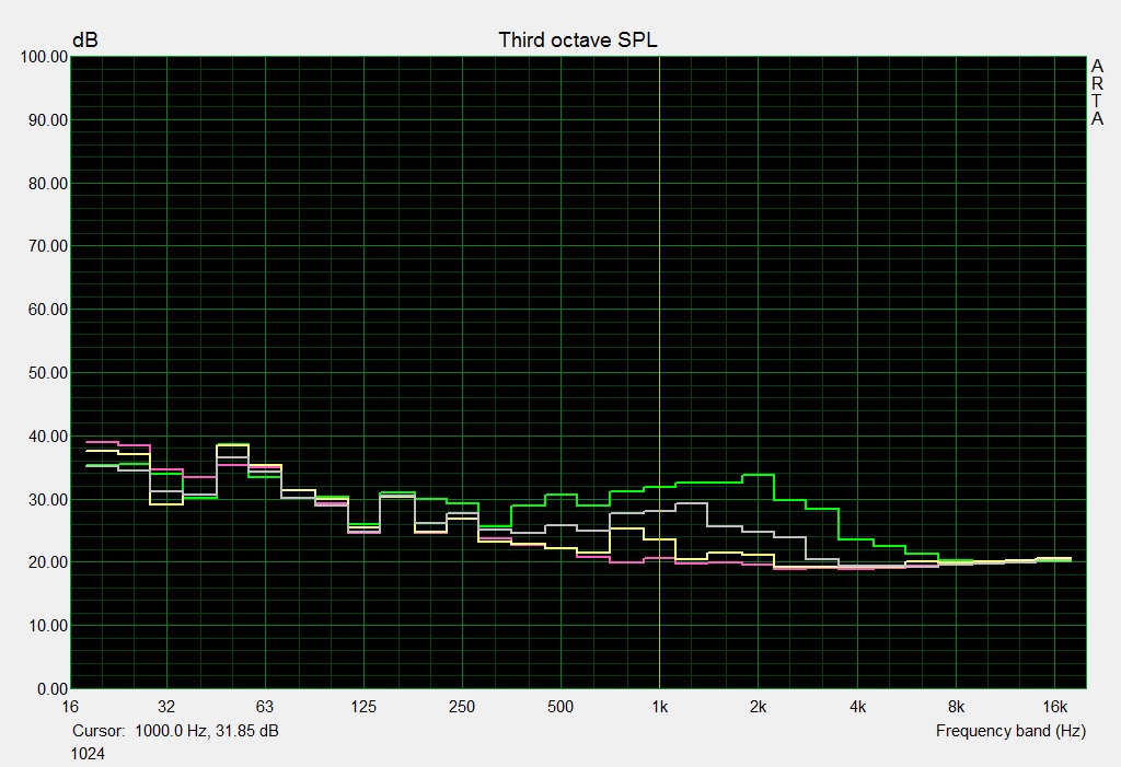 | Idle avg * (dB) | 32 | 32.4 -1% | 33.8 -6% | 32.8 -3% | 28.9 10% |