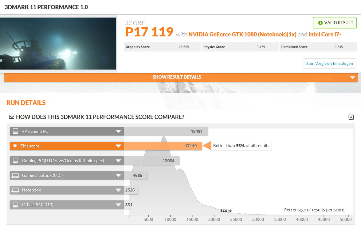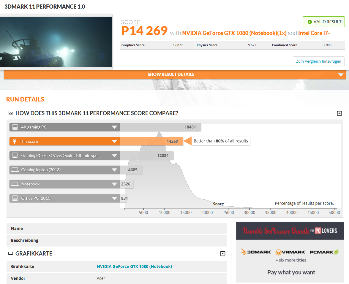 Die Gaming Performance haben wir ebenfalls im Akkubetrieb getestet. Dabei kam unser Testsample im 3DMark 11 auf 14.269 Punkte. Die Leistungsbeschneidung im Akkubetrieb ist somit nicht ganz so drastisch wie befürchtet. Ohne Steckdose steht jedoch nicht die Overclocking-Funktion zur Verfügung. Um dieses Feature nutzen zu können, muss zwingend das Netzteil angeschlossen sein und die Akkukapazität mehr als 30 % betragen.