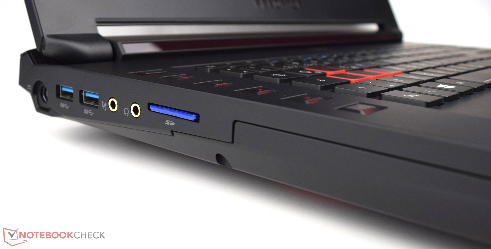 Der Speicherkartenleser des Acer Predator 17 X GX-792-76DL sitzt auf der linken Seite und verarbeitet die gängigen Formate SD, SDHC und SDXC. Eingelegte Speicherkarten verschwinden komplett in dem Schacht und ragen nicht darüber hinaus. Das vermindert die Gefahr von Beschädigungen beim Transport. Die Leistung des Kartenlesers prüfen wir mit unser Referenzkarte Toshiba Exceria Pro SDXC 64 GB UHS-II. Beim Kopieren von JPG-Dateien messen wir eine durchschnittliche Transferrate von 79 MB/s. Die sequenzielle Leserate beträgt 89 MB/s (AS SSD). Mit diesen Werten liegt das Acer Predator 17 X im Mittelfeld. Die beiden MSI Laptops (GT73VR und GT72VR) können bei den Transferraten nochmal eine Schippe drauflegen und sich klar gegen unser Testgerät durchsetzen.