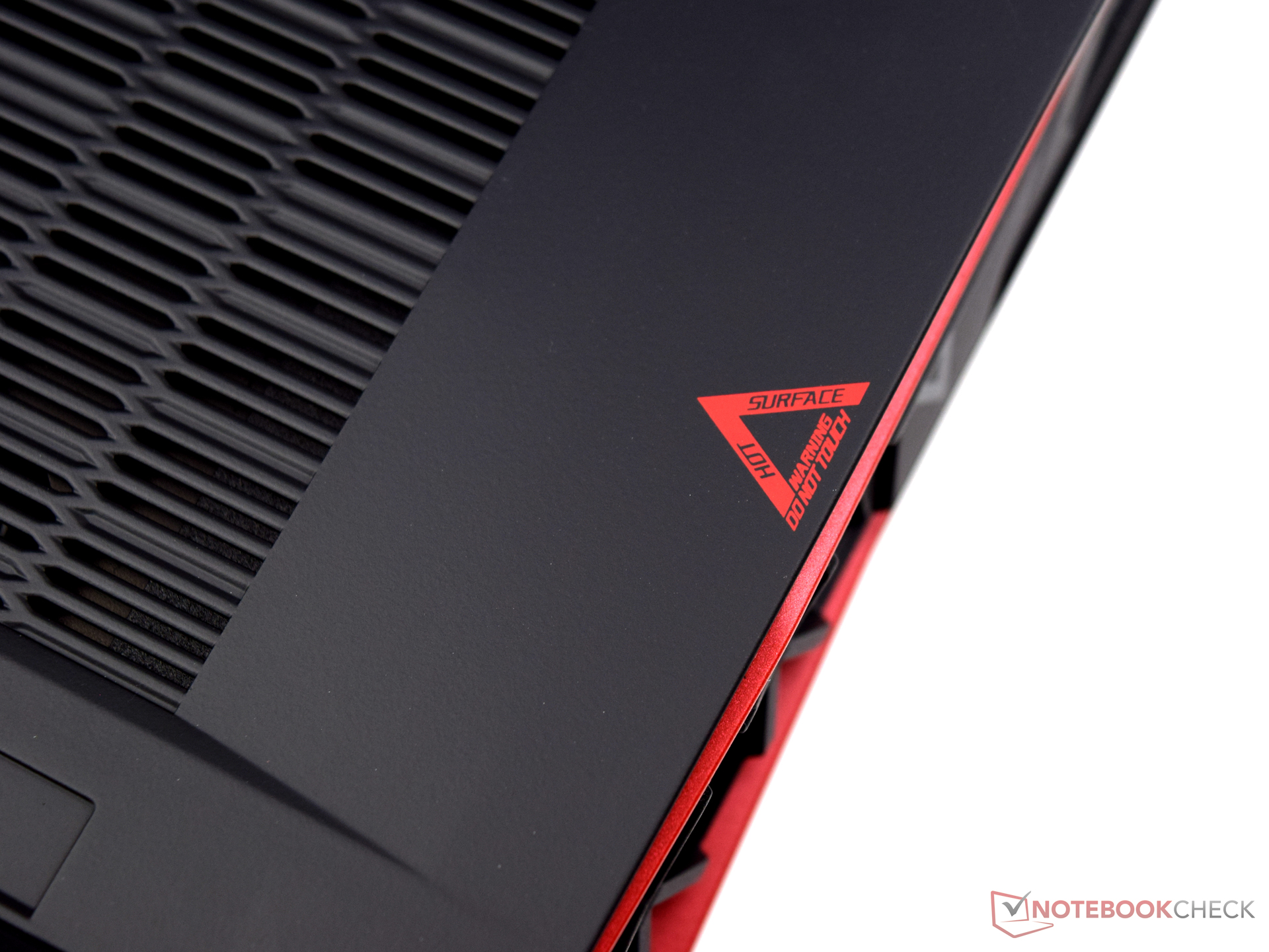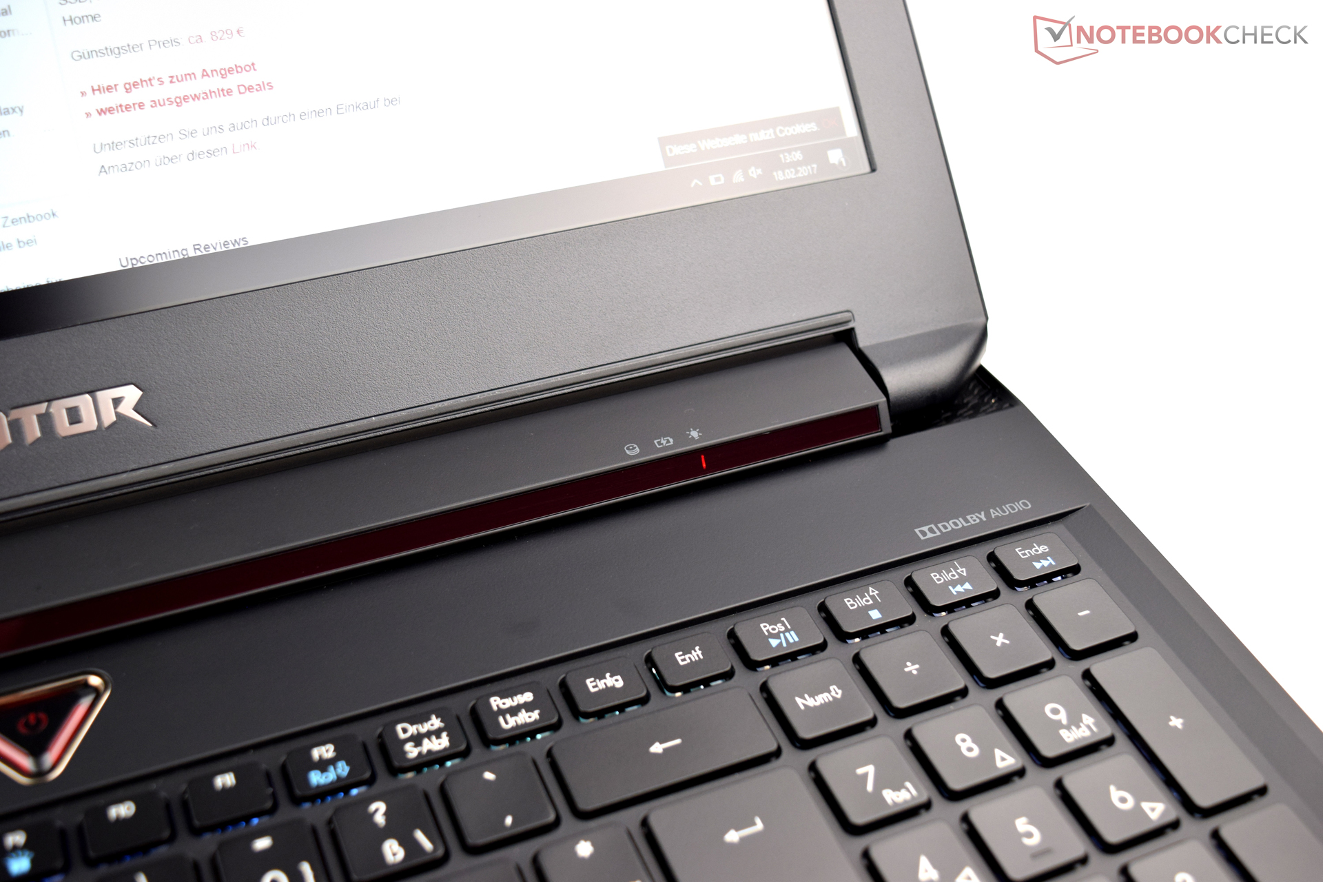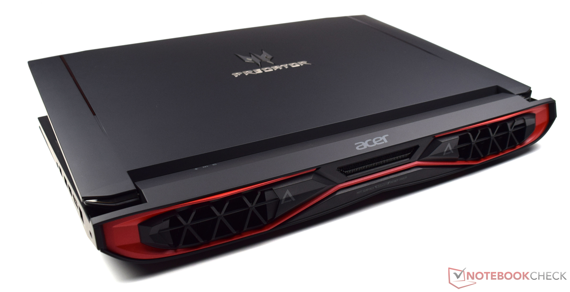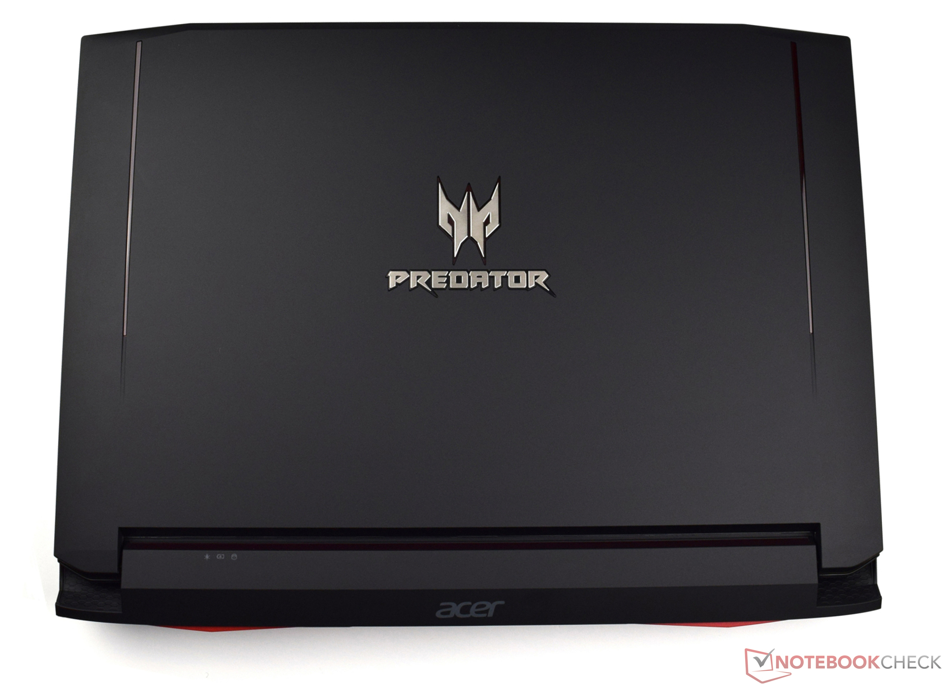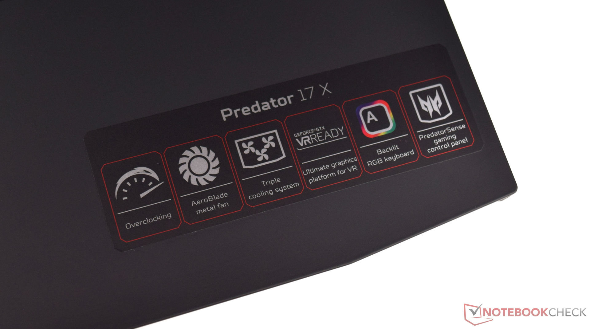 Beim Acer Predator 17 X überwiegen die bekannten Farben Schwarz und Rot, welche gut zusammenpassen. Das wuchtige Kunststoffgehäuse ist sauber verarbeitet. Die Soft-Touch-Oberflächen vermitteln ein gutes Gefühl, wenngleich diese aber sehr anfällig für Fingerabdrücke sind. Letztere lassen sich problemlos mit einem feuchten Tuch wieder entfernen. Den Gehäusedeckel zieren zwei rote Streifen und ein silbernes Acer-Logo, welche im eingeschalteten Zustand dezent mit einer roten Beleuchtung in Szene gesetzt werden. Beim Drucktest überzeugt die Base, welche nur minimal nachgibt. Der Displaydeckel ist nicht ganz so stabil wie die Base. Ein Verdrehen ist ohne Probleme möglich, wodurch sich das Panel leicht verfärbt. Beim punktuellen Druck lässt sich jedoch keine Wellenbildung auf dem Bildschirm erkennen. Das Display wird durch zwei Scharniere gut in Position gehalten, welche nur minimales Nachwippen produzieren. Das Öffnen des Deckels mit einer Hand ist aufgrund des hohen Gewichts der Base kein Problem.