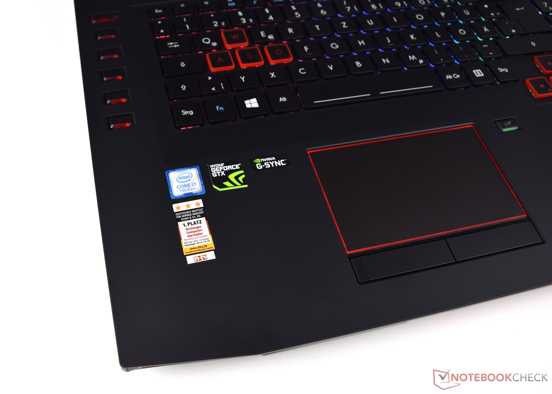 Das Touchpad misst ohne die separaten Tasten 10,5 x 6,5 Zentimeter. Die Oberfläche ist glatt, wodurch die Gleiteigenschaften sehr gut sind. Eingaben werden auch zu den Rändern hin problemlos umgesetzt. Gestensteuerung ist weiterhin mit bis zu vier Fingern möglich. Da Acer bislang noch keinen weiteren Treiber für das Touchpad anbietet, müssen Anwender mit den Windows-Einstellungen vorliebnehmen. Optisch ziert eine rote Umrandung die Eingabefläche. Damit schmiegt sich das Touchpad gut in die Farbkombination des Predator-Designs ein. Die dedizieren Maustasten sind relativ leichtgängig und arbeiten sehr leise. Ein akustisches Feedback in Form eines Klick-Geräusches gibt es nicht. Neben dem Touchpad befindet sich noch eine separate Taste. Mit dieser kann das Touchpad inklusive der Windows-Tasten deaktiviert werden. Die rote Umrandung wird dann ebenfalls ausgeschaltet und zusätzlich wechselt die Beleuchtung der kleinen Taste von Grün auf Rot.