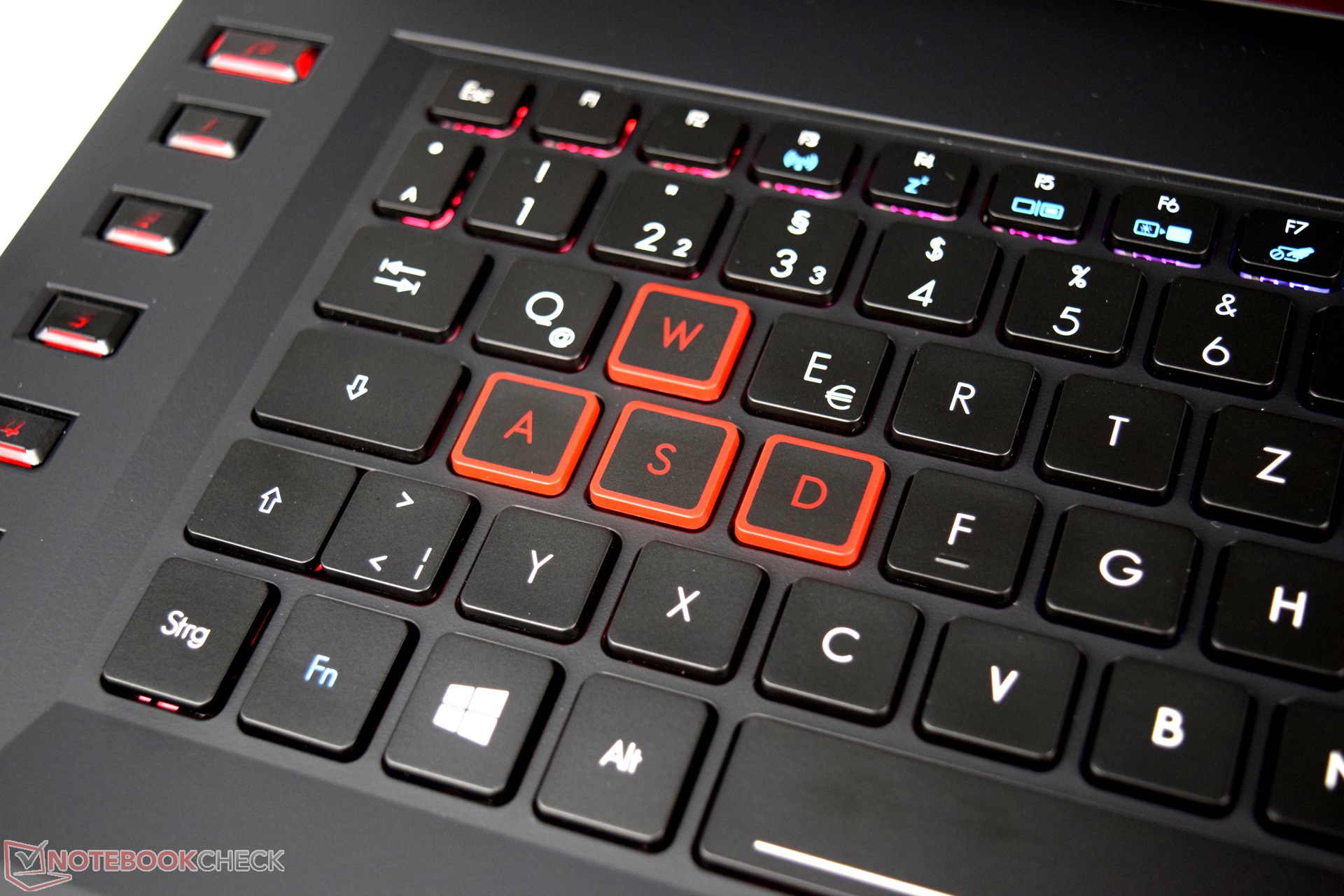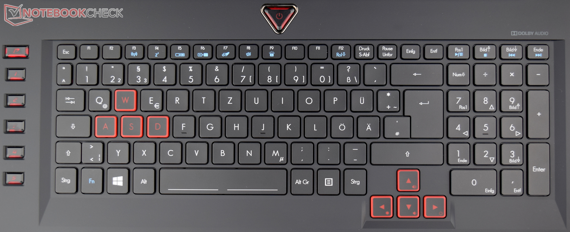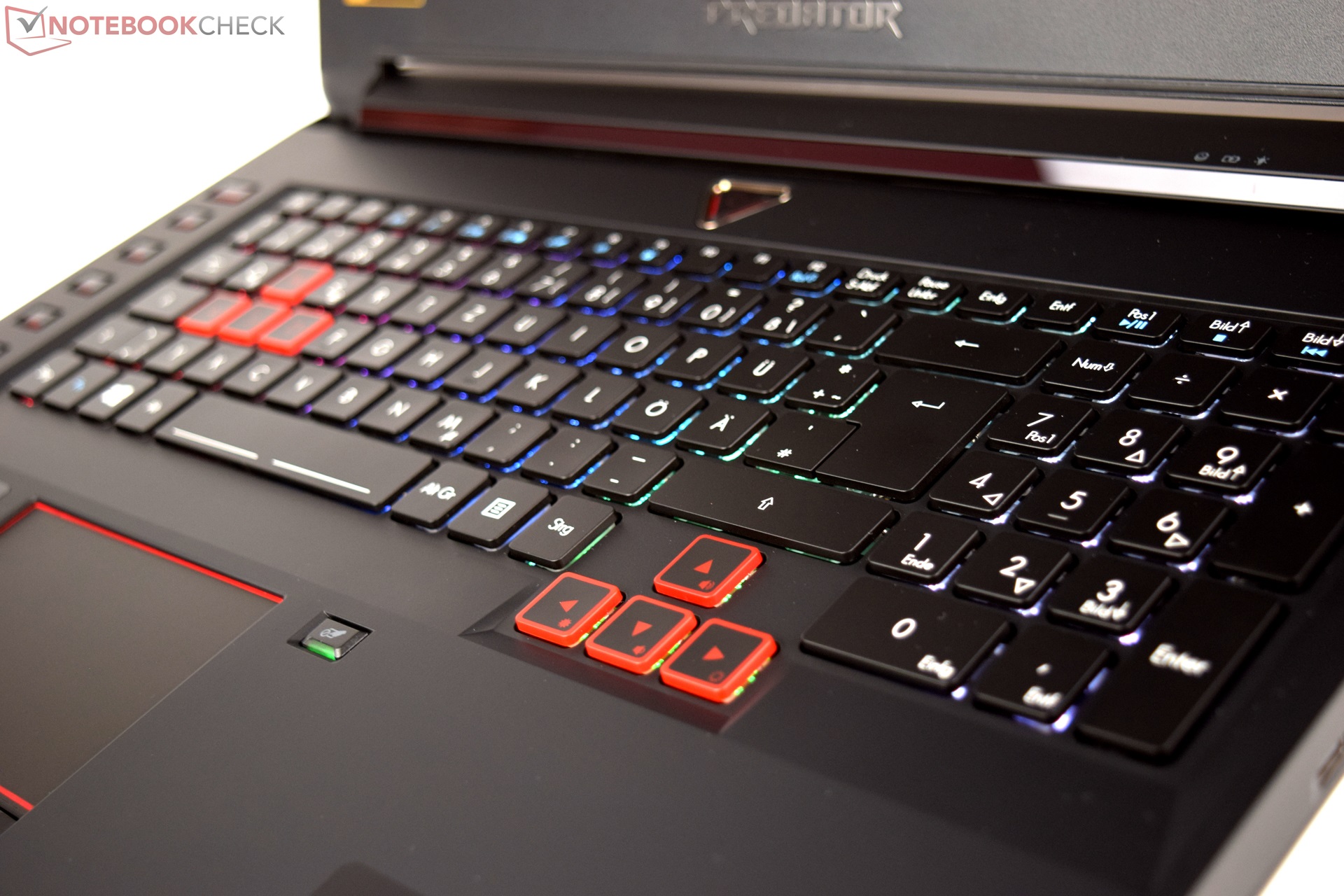 Die Tastatur des Acer Predator 17 X gleicht optisch und technisch dem Predator 17. Das Chiclet-Modell ist leicht abgesenkt direkt in die Base eingearbeitet. Nichts klappert und alles sitzt fest an seiner Stelle. Die Tasten selbst sind mit einer Größe von 15 x 15 Millimetern ausreichend und besitzen jeweils einen Zwischenraum von 3 Millimetern. Auch der vollwertige Nummernblock hat die gleichen Dimensionen, ebenso wie die leicht abgesetzten Pfeiltasten. Die Makrotasten befinden sich weiterhin auf der linken Seite und können über das PredatorSense-Tool konfiguriert werden. Die einzelnen Modi werden dann durch verschiedene Farben repräsentiert. Die 4-Zonen-Hintergrundbeleuchtung kann individuell angepasst werden.