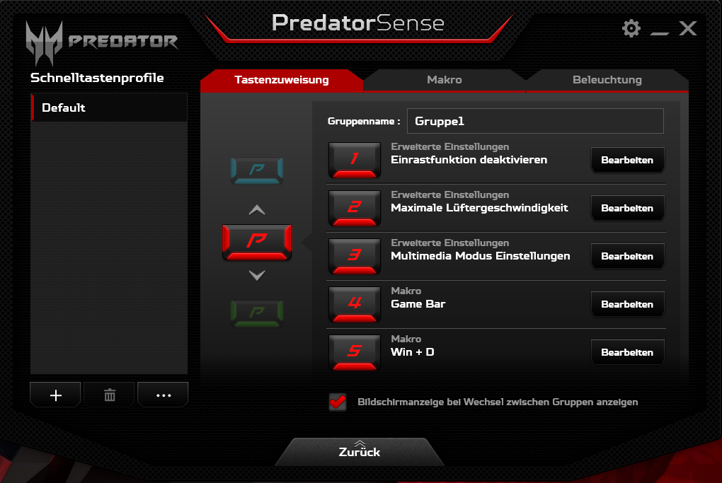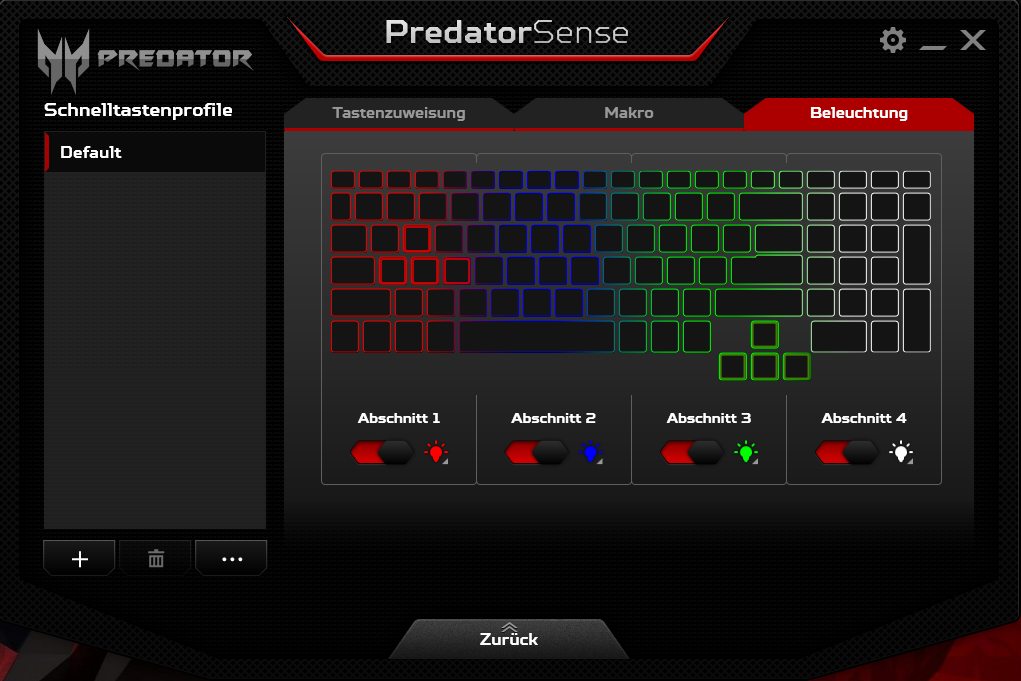 "PredatorSense" ist die Softwarekomponente, mit der sich das Gerät konfigurieren lässt. Sehr umfangreich ist die Lösung nicht, bietet aber alles, was man braucht. Per PredatorSense können die Makro-Tasten belegt werden, oder aber auch die Hintergrundbeleuchtung der Tastatur (4 Zonen) auf die eigenen Bedürfnisse angepasst werden. Viel wichtiger für den Test war die Overclocking-Funktion, welche es ermöglicht, den Prozessor und die Grafikkarte in zwei Stufen zu übertakten. Hierfür ist aber zwingend der Netzbetrieb erforderlich, da das Feature sonst nicht zur Verfügung steht. Darüber hinaus liefert das PredatorSense Hauptmenü einen guten Überblick über den aktuellen Systemzustand. Als weiteres Tool dient das Acer-Care-Center, welches Informationen zum Produkt zeigt und Vorschläge zur Optimierung bietet. Der Sound lässt sich über die Dolby-Audio-Software einstellen.