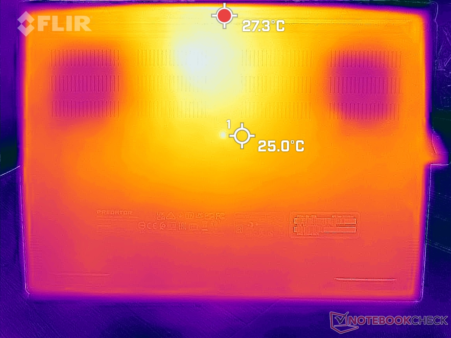Auf der Ober- und Unterseite werden im hinteren Gehäusebereich Maximaltemperaturen von 43 °C bzw. 46 °C erreicht, wie die Wärmebilder unten zeigen. Die Oberflächentemperaturen sind insgesamt spürbar kühler als beim Zephyrus G14 und dem Alienware x14, die unter ähnlichen Bedingungen jeweils über 50 °C erreichen.